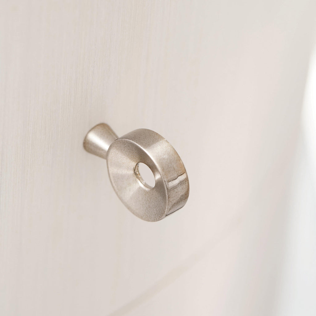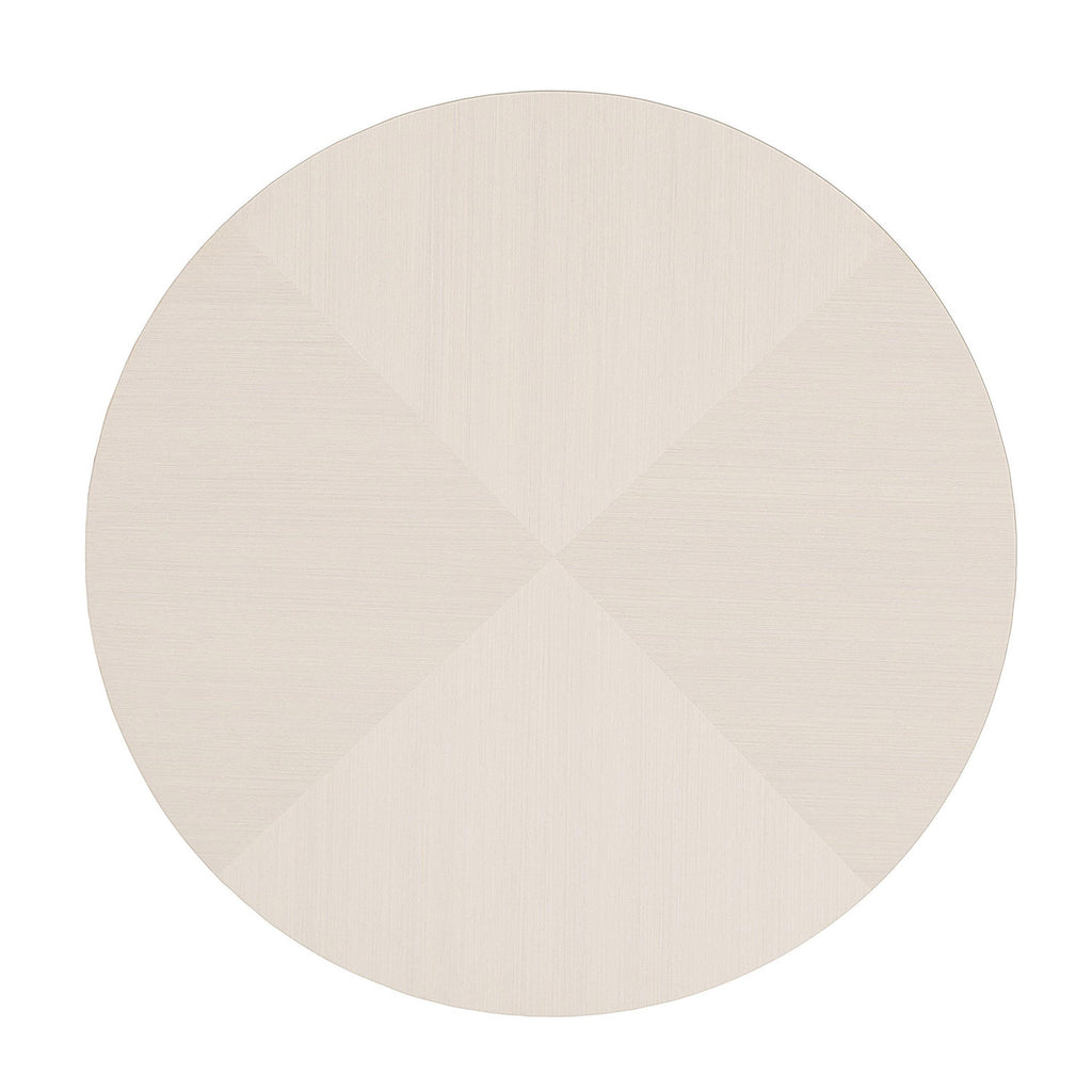 Showcasing a devotion to craftsmanship, the Bernhardt Axiom round chairside table features a fancy face top and a 3-D inverted pyramid design on the drawers. Poplar solids and engineered faux anigre veneers are presented in a silky, low-sheen Linear White finish. Adding to the glamorous appeal, circular knobs crafted from nickel-plated zinc are finished in a lustrous Brushed Silver. With its unique veneer patterns and sophisticated accents, this warm and inviting piece delivers elevated visual appeal.