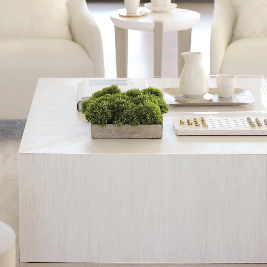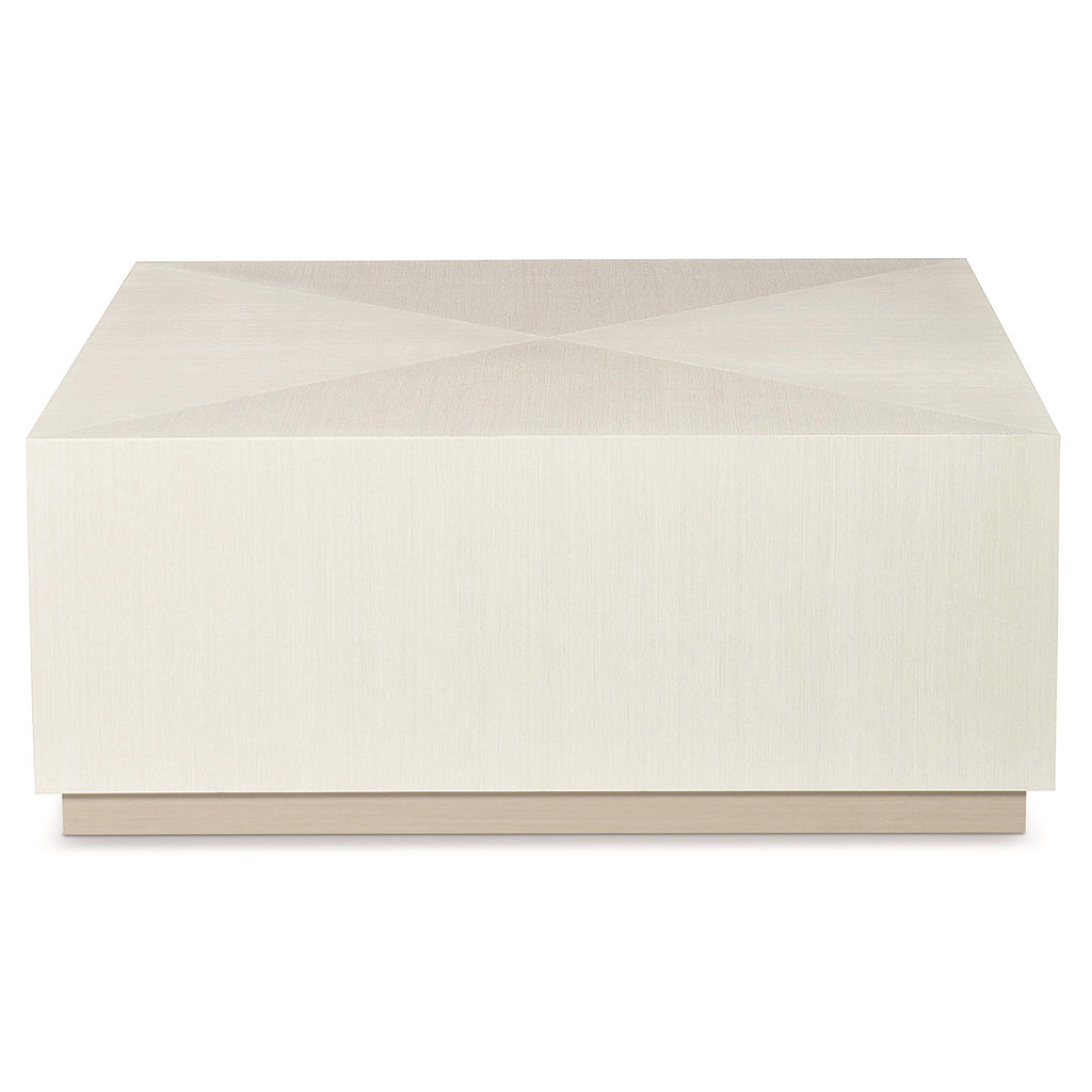 The Berhardt Axiom square cocktail table uses angular shapes and light, silky finishes to create a distinct style. Crafted from poplar solids with engineered faux anigre veneers in a low-sheen Linear White finish, the top features a fancy face pyramid pattern that highlights the beauty of the veneers. Completing the clean, contemporary look, a plinth base is finished in Linear Gray.
