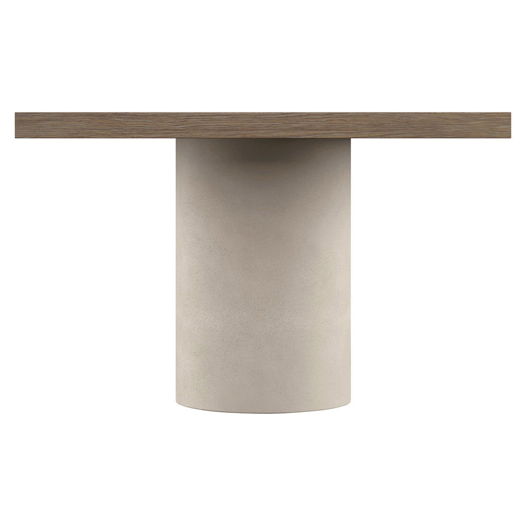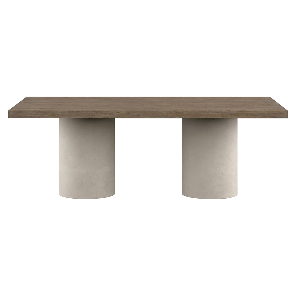 Warm, effortless and tranquil, the Bernhardt Casa Paros dining table finds its inspiration in organic themes. Two round pedestal bases in cast resin have the look of stone in Bedrock faux concrete finish. They support the wood top in Playa finish for the perfect balance of contrasting materials.