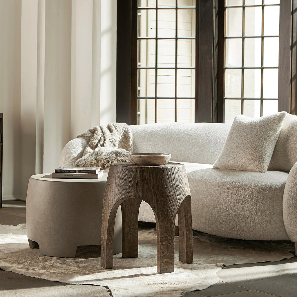 With inspiration taken from an organic drum shape, the Bernhardt Casa Paros side table is given a sleek modern update. Crafted of wood in Playa finish, the table has cutout legs that feature high arches and a softly concaved top with an end grain pattern.
