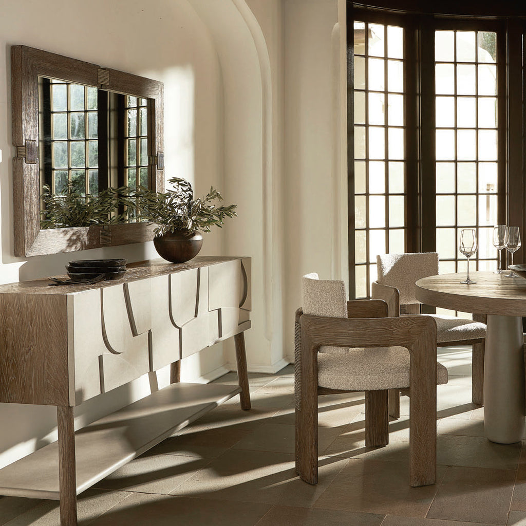 Texture and dimension carve a signature look onto the Casa Paros sideboard. Three cast resin faux concrete soft-close doors are refined in Bedrock finish. The top and splayed legs feature the warm Playa finish, and a bottom shelf is also finished in Bedrock. Behind each door are adjustable and removable shelves.