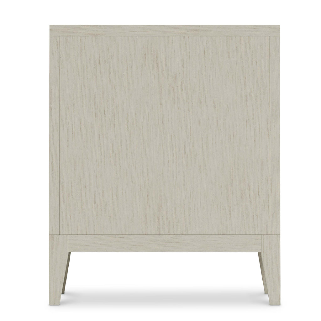 The Bernhardt Cornelia nightstand has a traditional design that is updated for modern living with brushed stainless steel metal inlays around its three drawers. Lines are sleek and refined, while the Nebbia finish gives the piece a more casual style. The design also includes two-port USB charging unit.