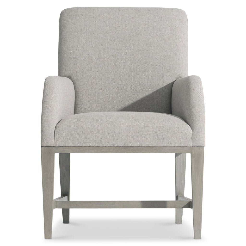 The Bernhardt Cornelia arm chair combines graceful lines and the comfort of upholstery for a chic arm chair. The exposed wood base offers curved lines on the back with straight lines at the front. Featured in the Nebbia finish.