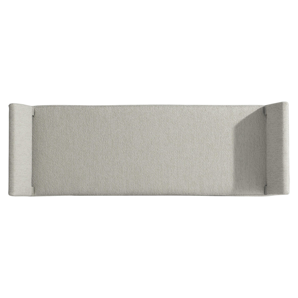 The sides of the Bernhardt Cornelia bench curve dramatically from the floor to the top of the padded arms. Combined with the straight lines of the upholstered seat, the design highlights a refined neotraditionalism. The exposed wood frame is featured in the Nebbia finish.