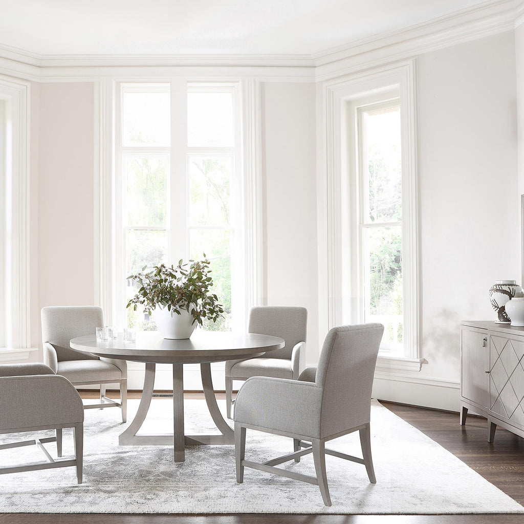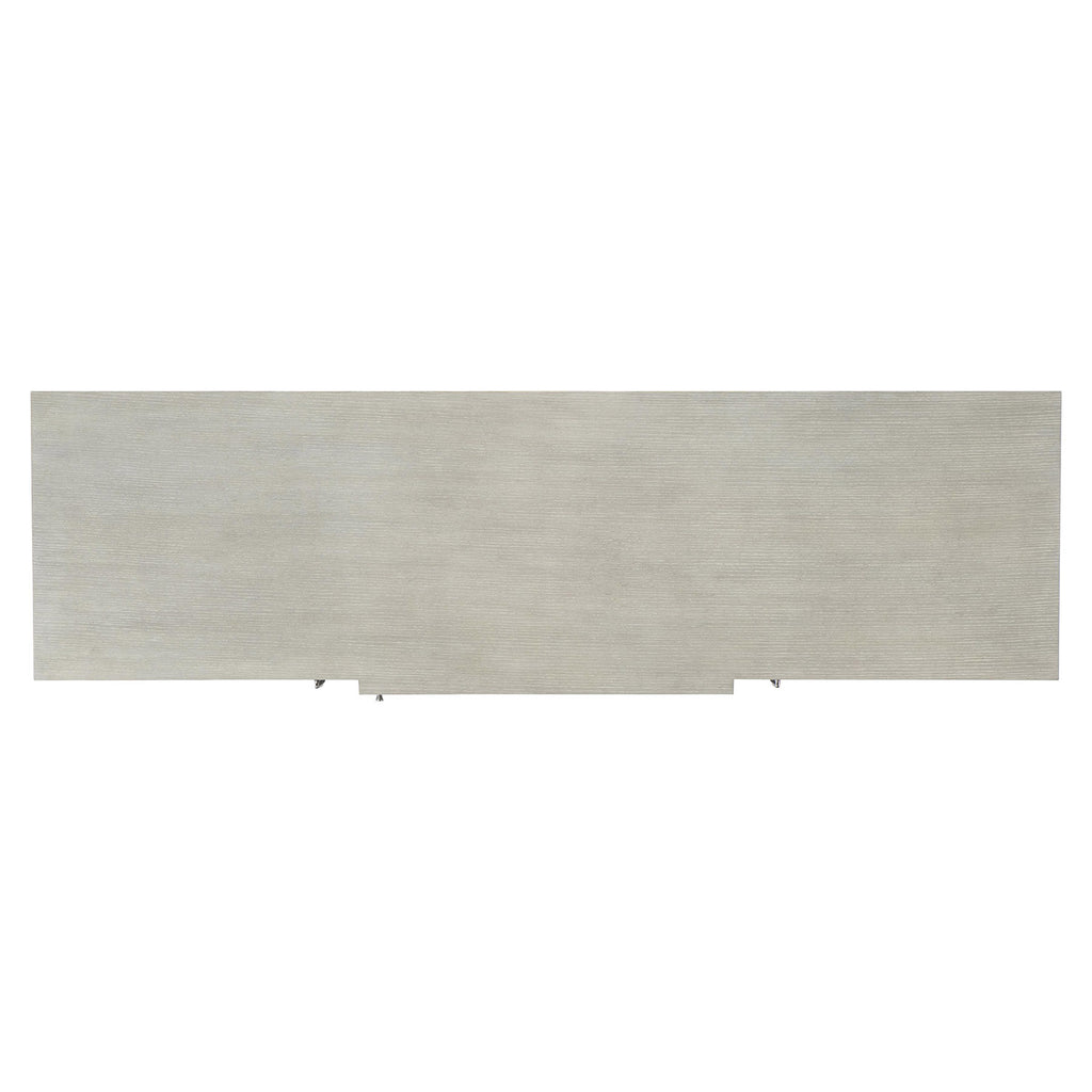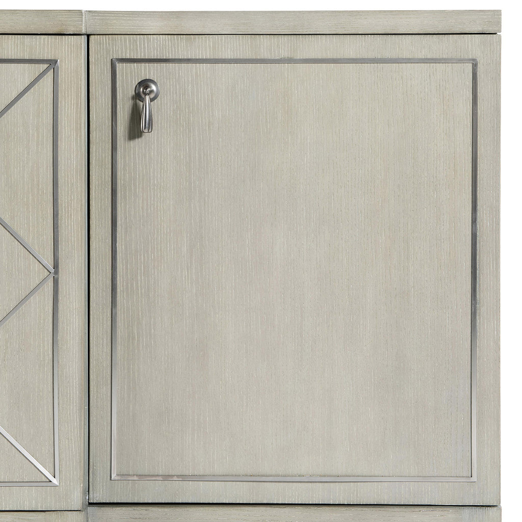 A subtle glamour is revealed in the brushed stainless steel diamond pattern overlay on the Bernhardt Cornelia buffet's center door. The two side doors showcase a brushed stainless steel inlay detail. The gleam of the metal is a perfect complement to the simple lines of the wood case, featured in the Nebbia finish.