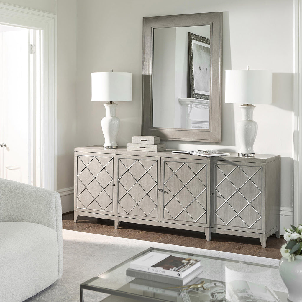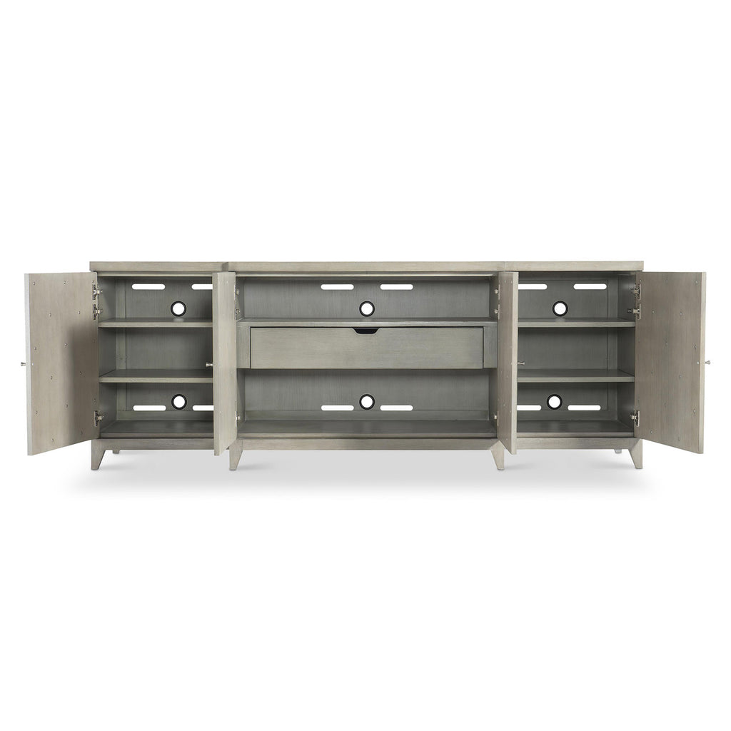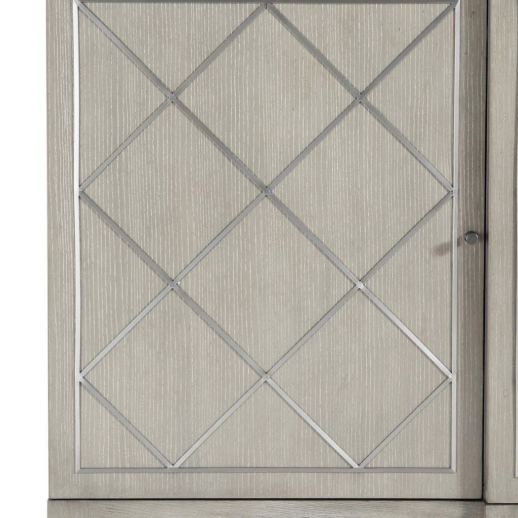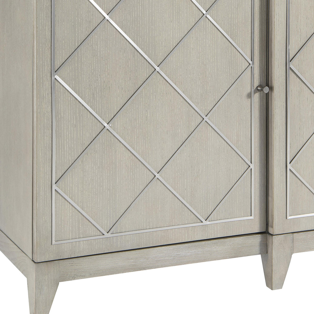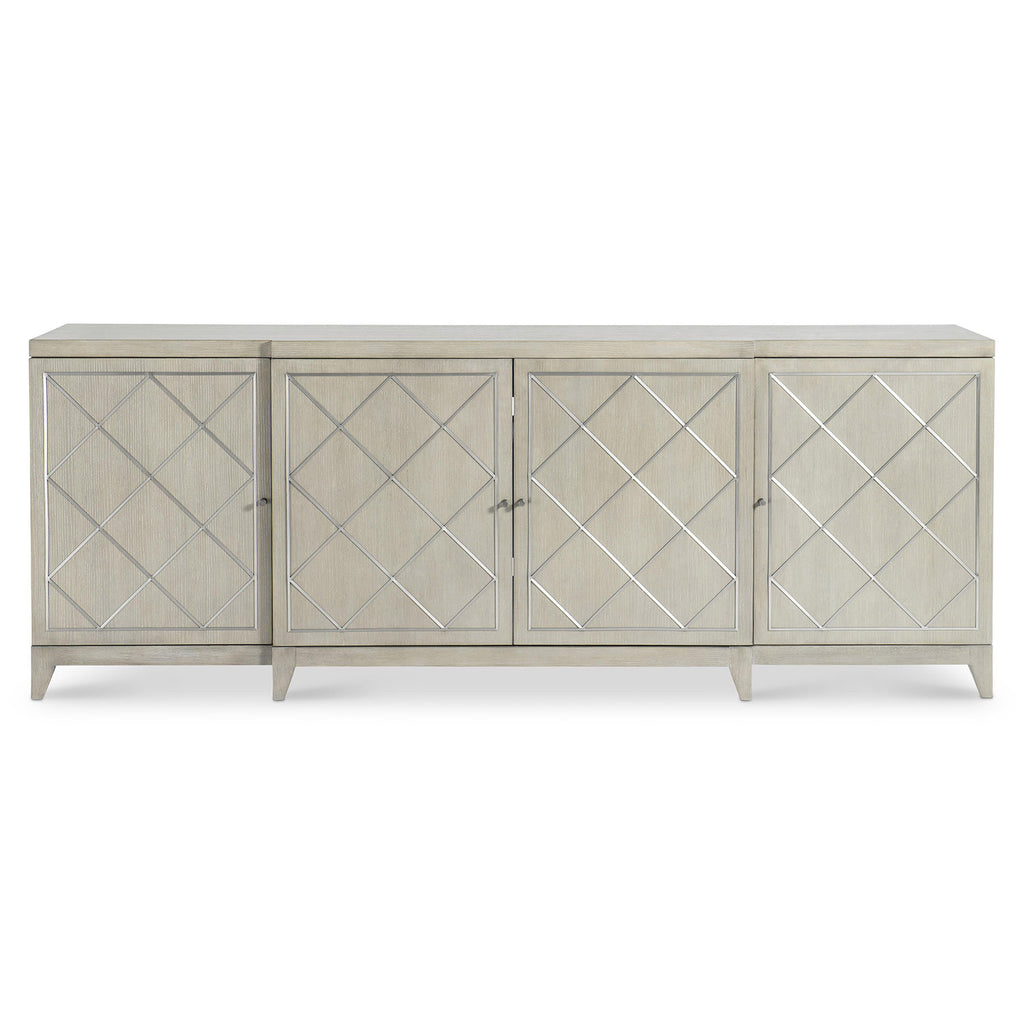 A subtle glamour is revealed in the brushed stainless steel diamond pattern overlay on the Bernhardt Cornelia entertainment credenza's three doors. The gleam of the metal is a perfect complement to the simple lines of the wood case, featured in the Nebbia finish. Each door has one round knob pull in the Glazed Stainless Steel finish. There are two adjustable shelves behind the outer doors and one large drawer behind the center doors.