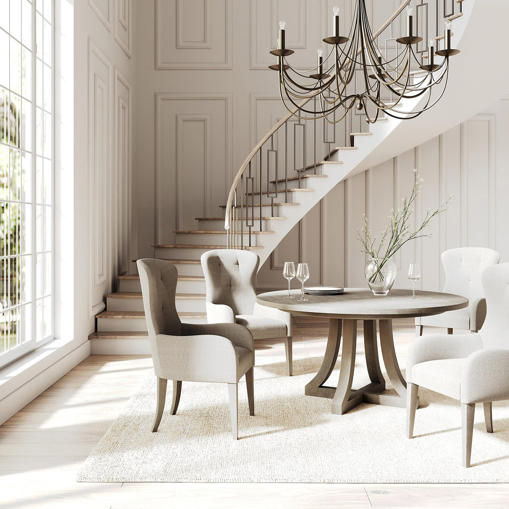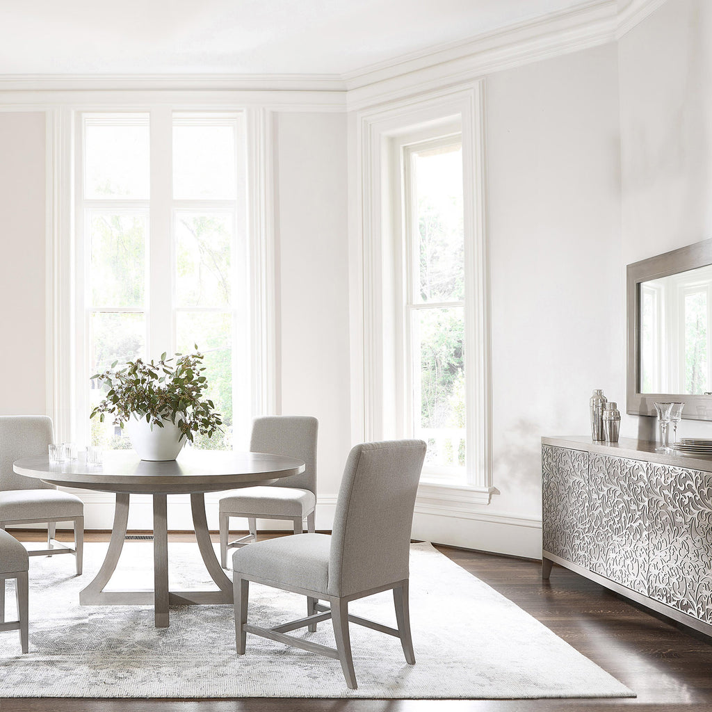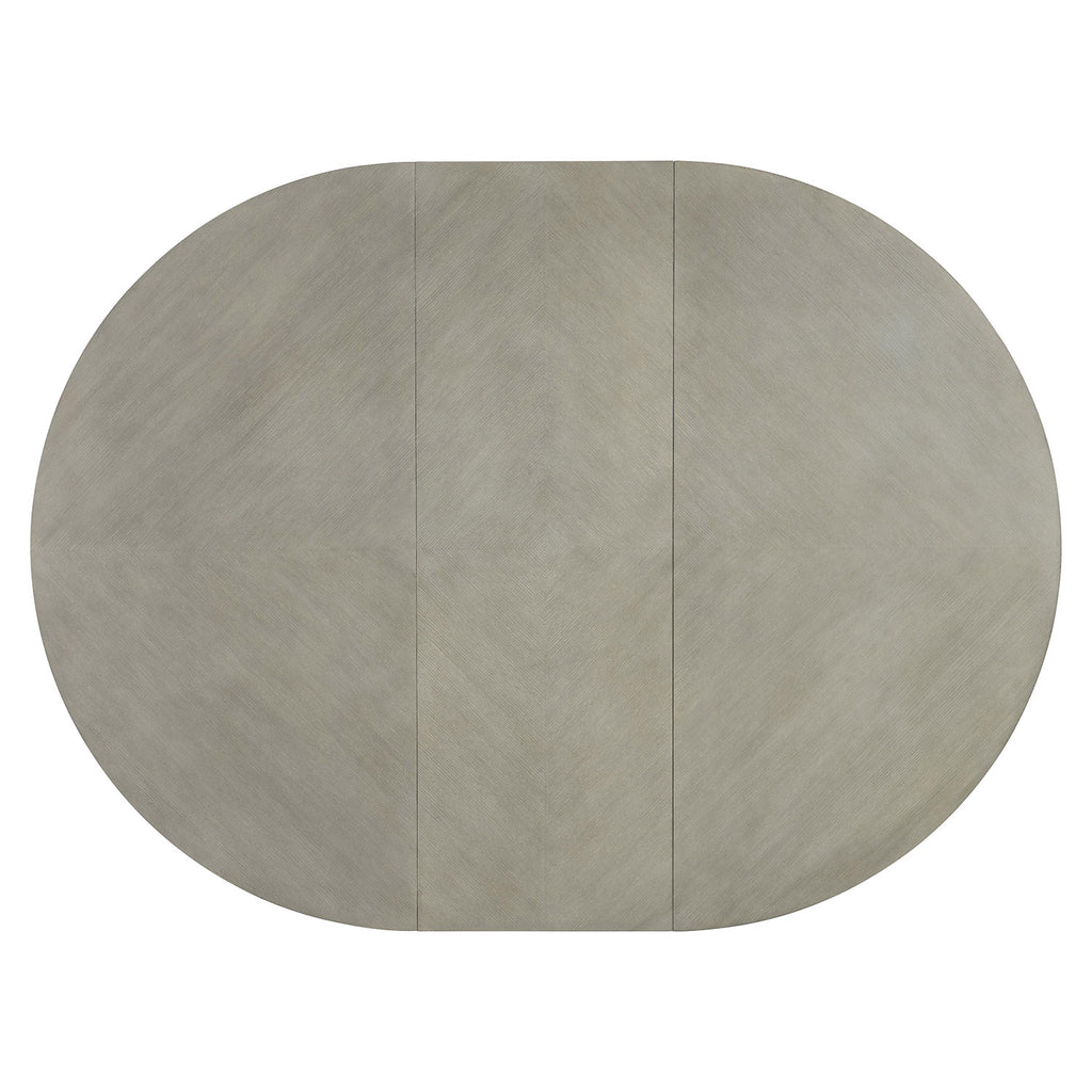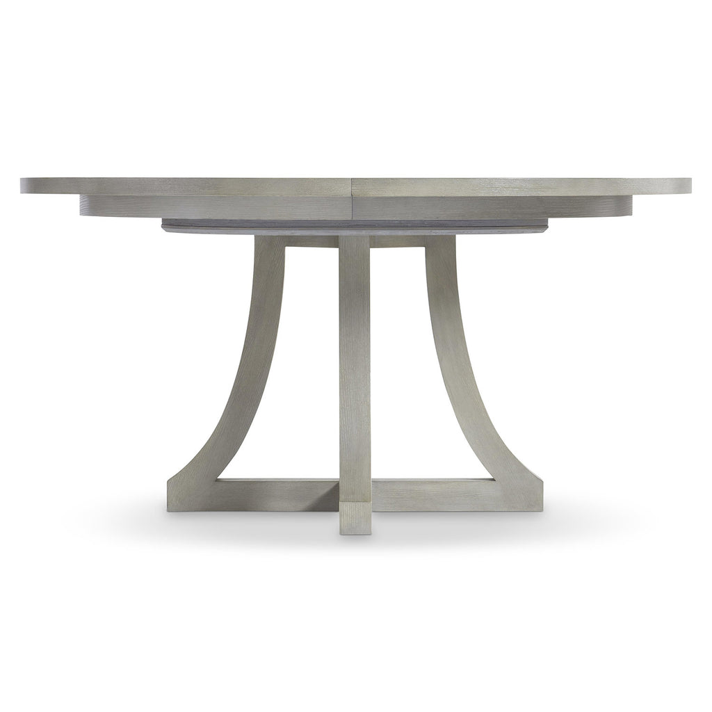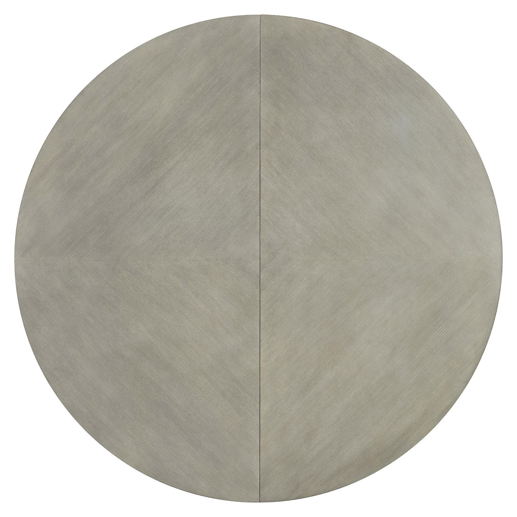 The gentle shape of four concave legs and a subtle grain pattern on the top offer a restrained elegance for the Bernhardt Cornelia dining table. The base curves up to support the round top, which can expand to an oval shape with the addition of a leaf. The beautiful design is highlighted by a light gray Nebbia finish.