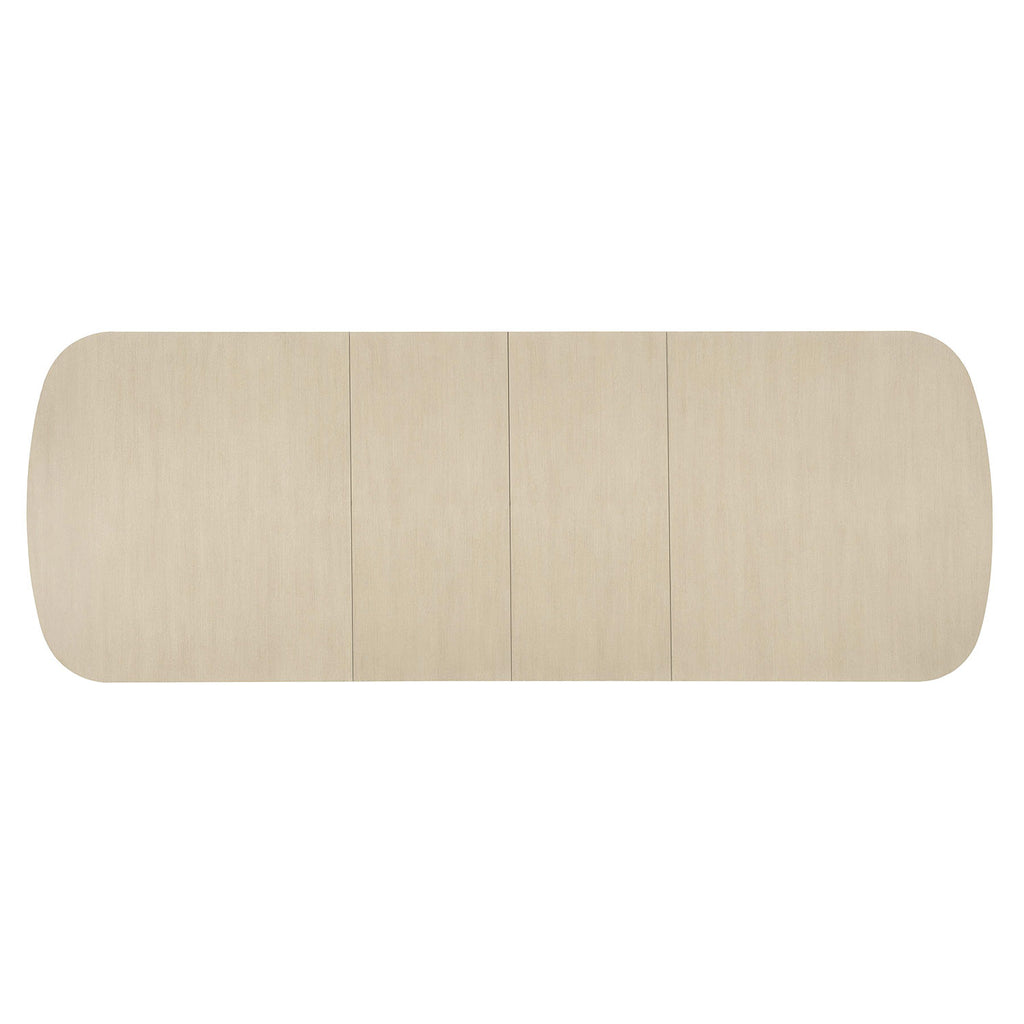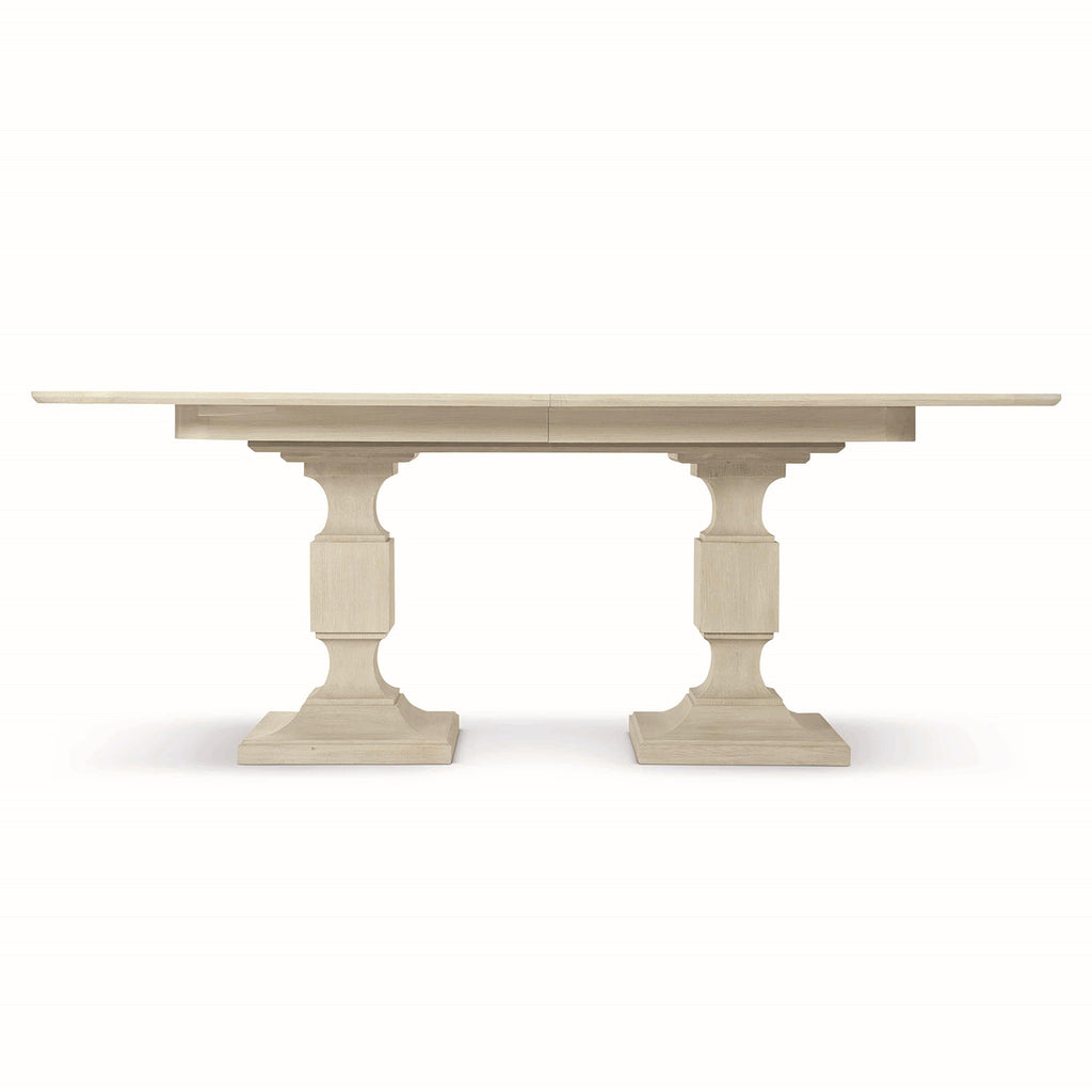 This all-wood Bernhardt East Hampton dining table is designed for versatility. While perfect for an intimate space, its two-pedestal base and two 20” leaves allow it to extend to accommodate large groups. Its decorative cerused finish is created from a combination of different colored pigments to highlight the wood’s natural grain pattern, creating a distinct handmade, elegant look.