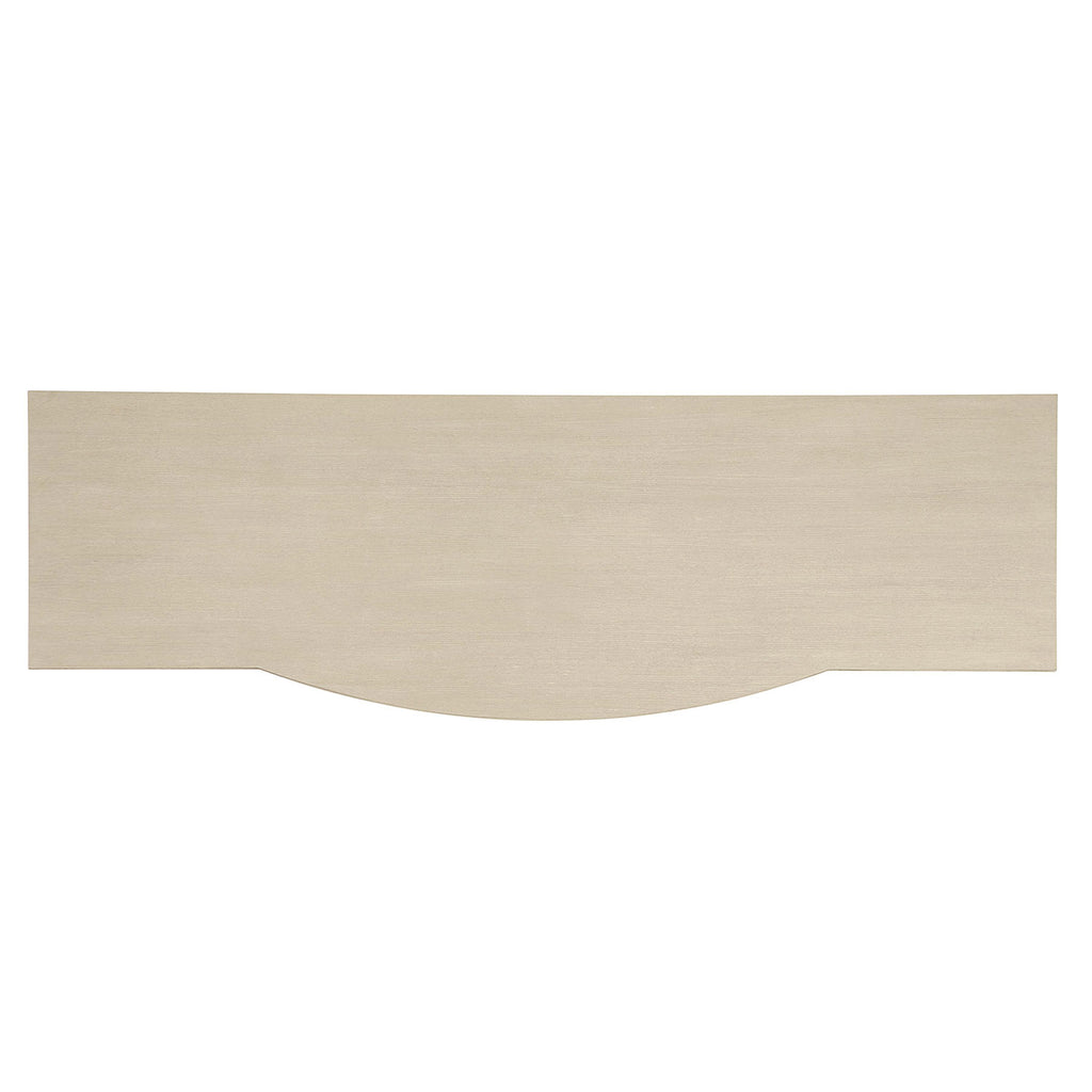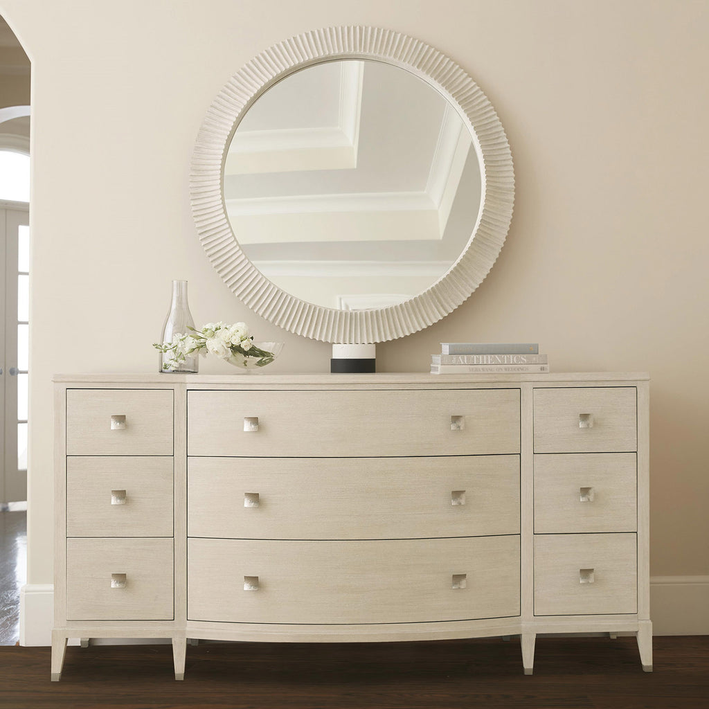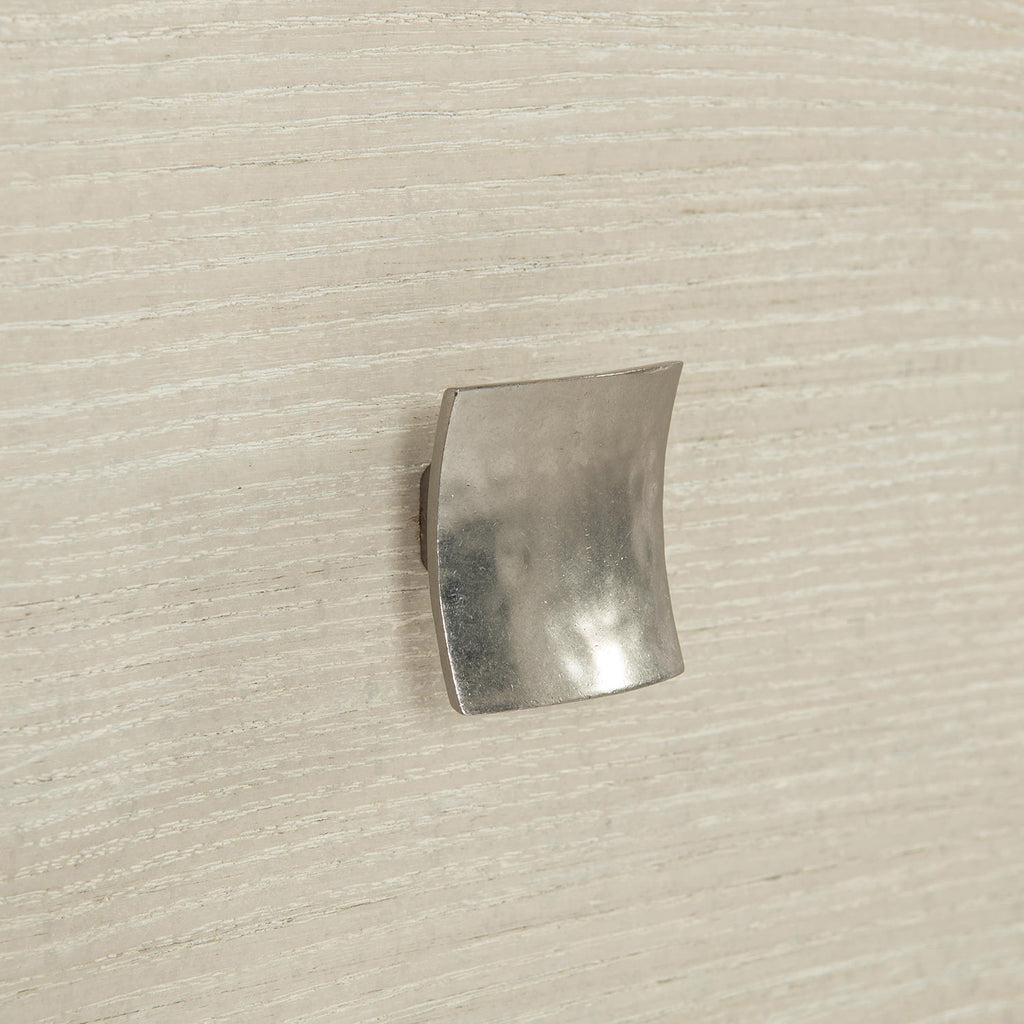 The Bernhardt East Hampton dresser maintains a minimalist sensibility, though its elegant lines and refined proportions reveal a subtle sophistication. Achieved through meticulous craftsmanship, a Cerused Linen finish highlights the linear wood grain of the quartered ash veneers. Shaped in rectangles with a gentle concave form, the hardware is forged in die cast nickel-plated zinc with an Aged Silver finish, adding texture and a delicate luster. Details such as a bowed front, wood beading and metal ferrules contribute to the refined aesthetic.