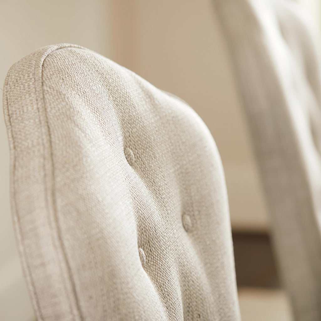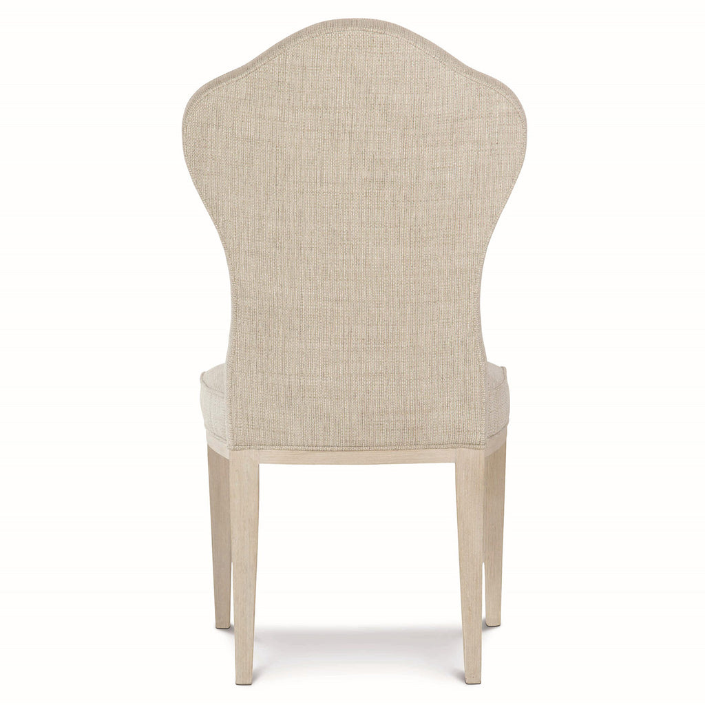 The Bernhardt East Hampton collection is defined by its minimalist aesthetic, achieved through soft finishes, graceful curves and subtle accents. A modernist interpretation of the iconic English throne chair, this timeless piece features a classic throne back with button tufting. The muted gray fabric features a subtle weave, adding softness and texture that complements the curved shape of the chair. The upholstery is welted for a clean, crisp finishing touch.