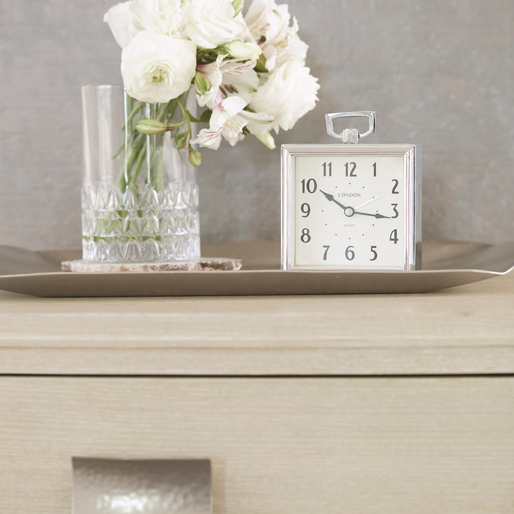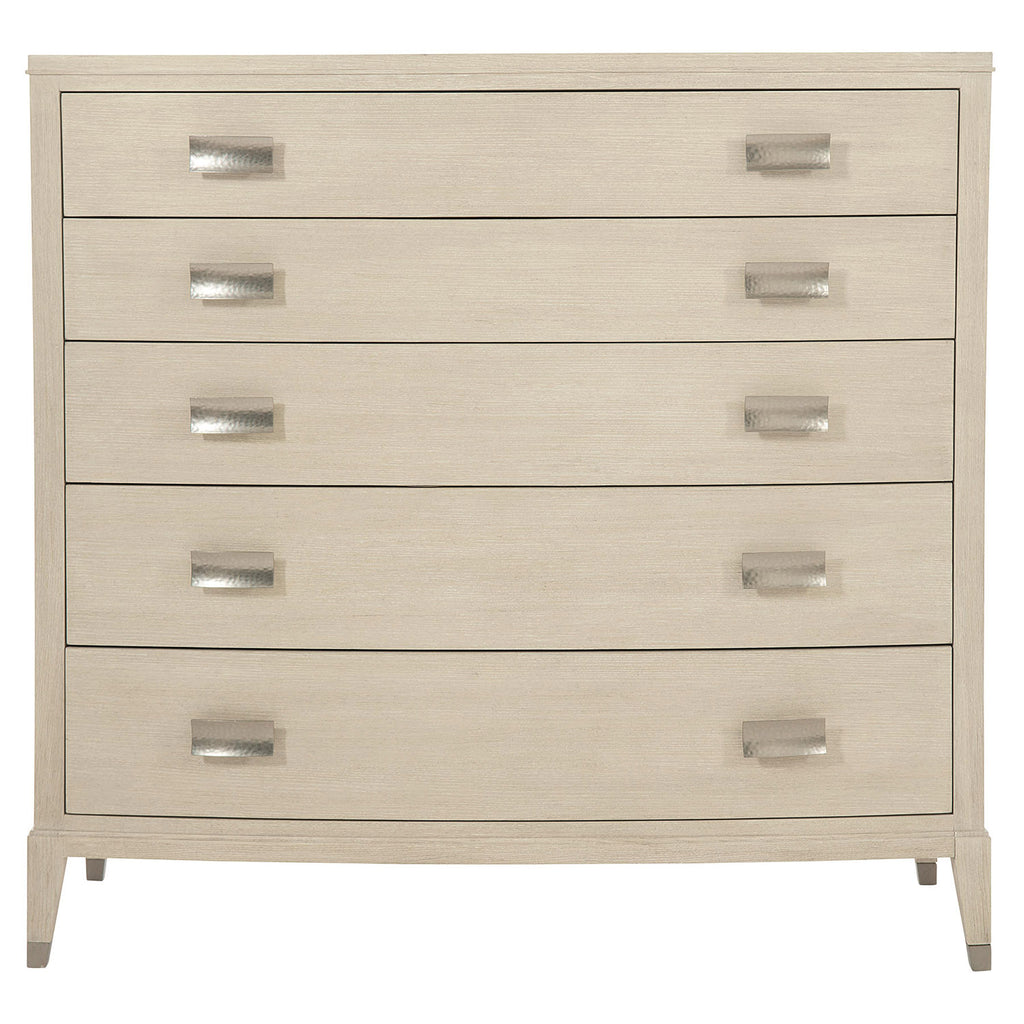 The Bernhardt East Hampton tall chest maintains a minimalist sensibility, while its elegant lines and refined proportions reveal a subtle sophistication. Achieved through meticulous craftsmanship, a Cerused Linen finish highlights the linear wood grain of the quartered ash veneers. Shaped in rectangles with a gentle concave form, the hardware is forged in die-cast nickel-plated zinc with an Aged Silver finish, adding texture and a delicate luster. Details such as wood beading and metal ferrules contribute to the refined aesthetic.