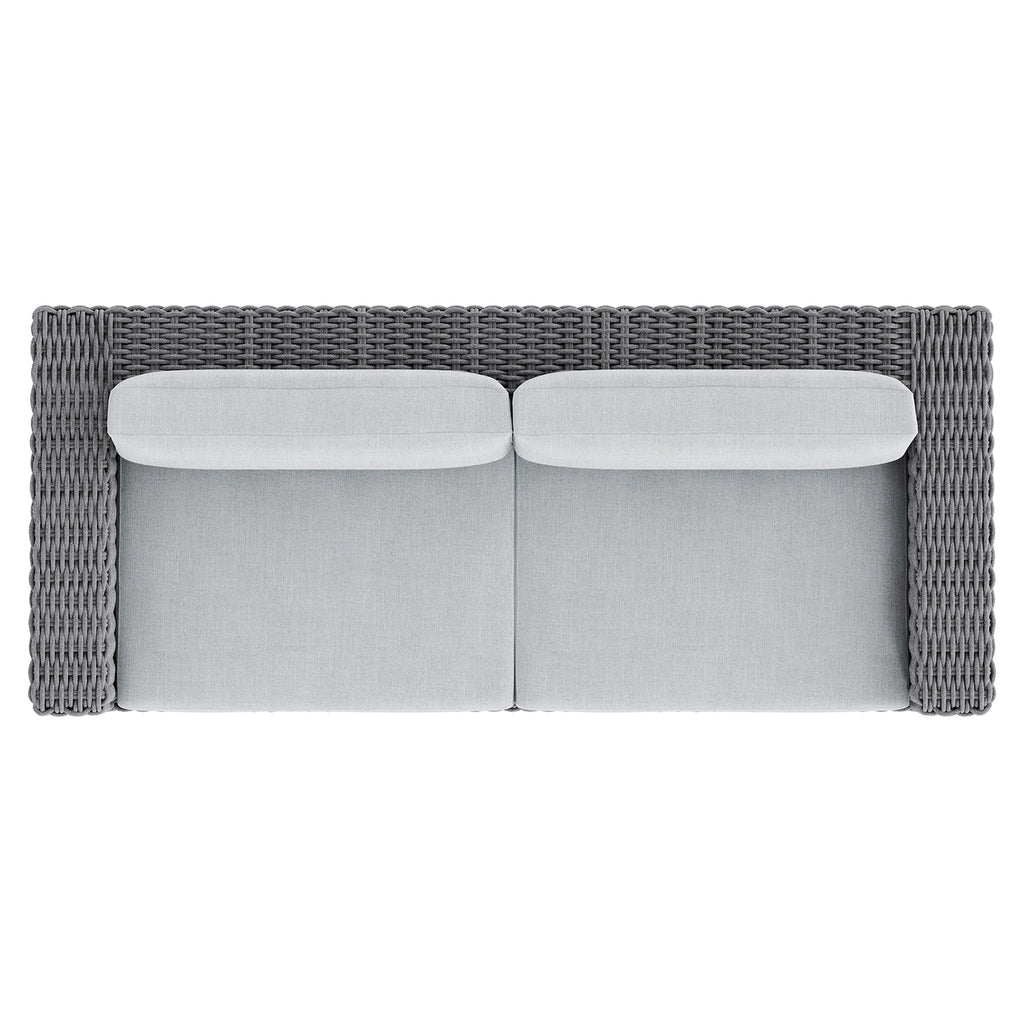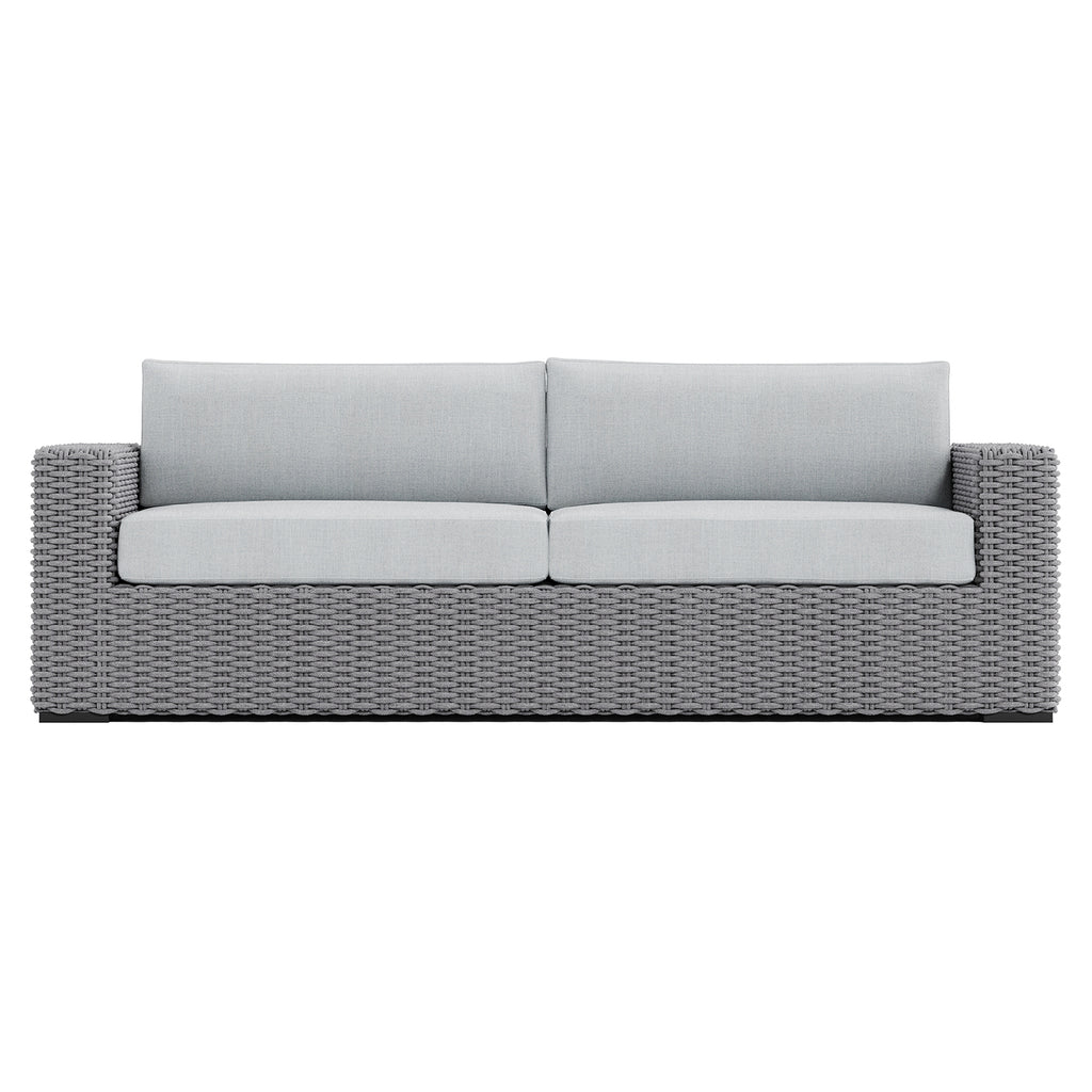 Crafted from woven rope in a Gray Mist finish, the Capri sofa is linear and low-profile with track arms and aluminum block feet. The ultra-modern frame holds loose fiber back pillows and plush cushions designed for luxurious comfort and maximum water resistance. A natural aesthetic meets contemporary style for a sophisticated yet relaxed feel.