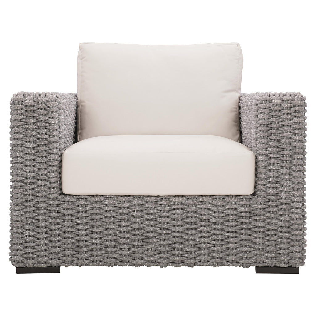 Bernhardt Exteriors is characterized by exceptional luxury, ultimate comfort and stylish design. Suitable for indoor and outdoor use, the Capri chair features a modern, low-profile frame crafted from woven rope in a gray Mist finish. Track arms and aluminum block feet contribute to the contemporary look, while the rope lends a natural, relaxed feel. The fiber back pillow and plush cushion are designed for luxurious comfort and maximum water resistance.