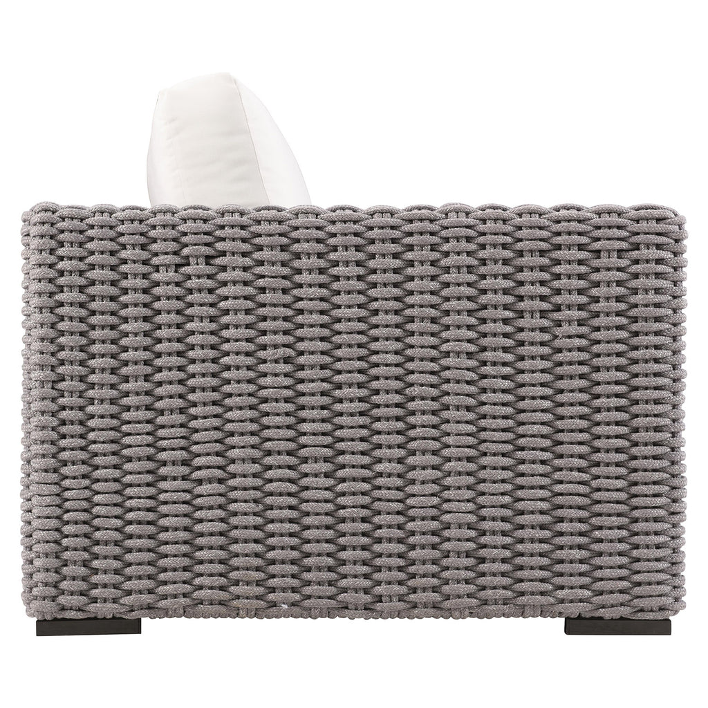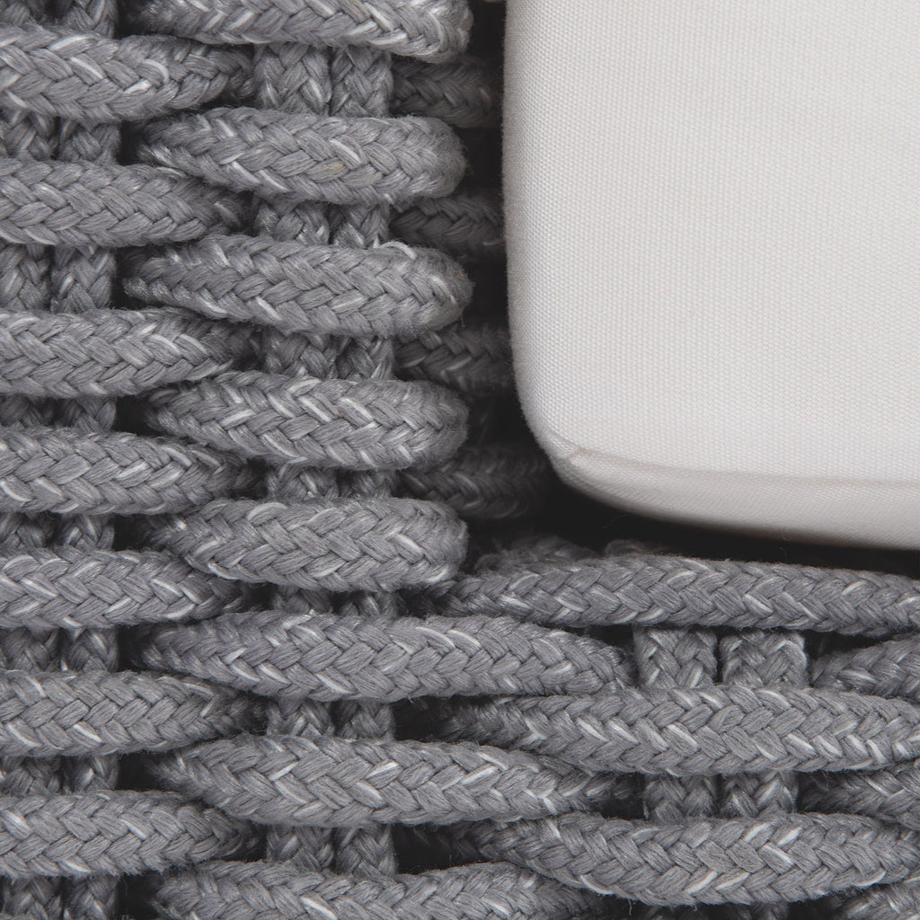 Bernhardt Exteriors is characterized by exceptional luxury, ultimate comfort and stylish design. Crafted from woven rope in a Gray Mist finish, the Capri sofa is linear and low-profile with track arms and aluminum block feet. The ultra-modern frame holds loose fiber back pillows and plush cushions designed for luxurious comfort and maximum water resistance. A natural aesthetic meets contemporary style for a sophisticated yet relaxed feel.