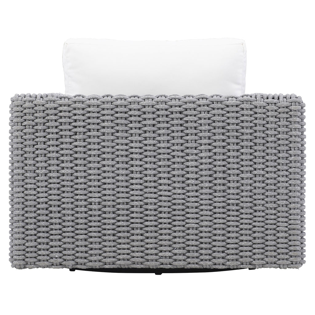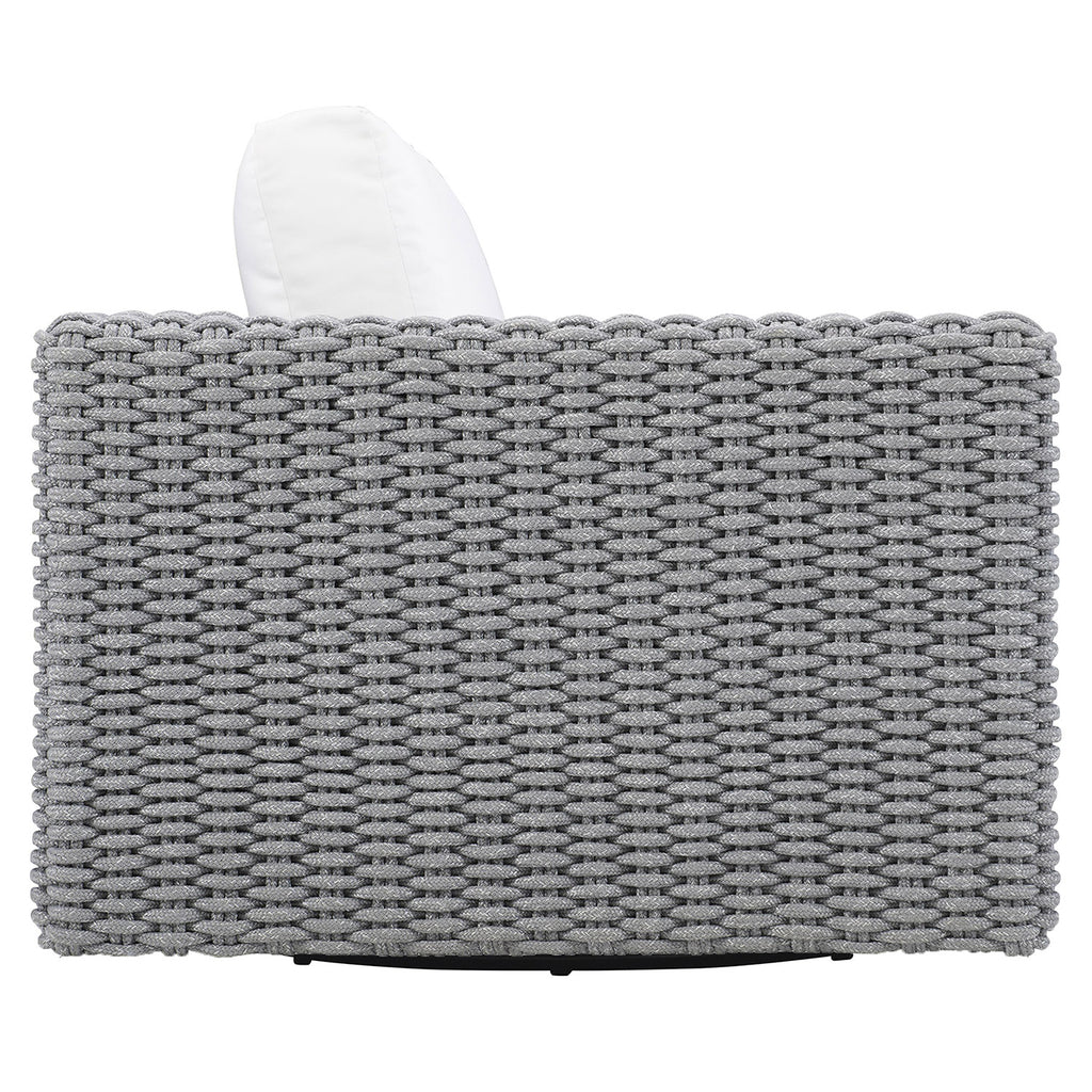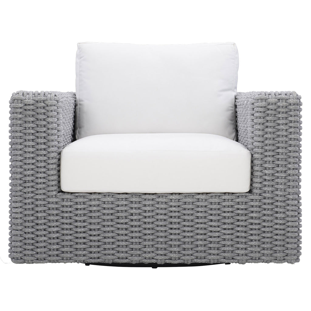 Engineered for outdoor use, the Bernhardt Exteriors Capri swivel chair extends the indoor aesthetic outside. Loose fiber-back, quick dry foam seat and back cushions rest on a handsome hand-crafted rope base on a swivel. A powder-coated aluminum frames adds durability.