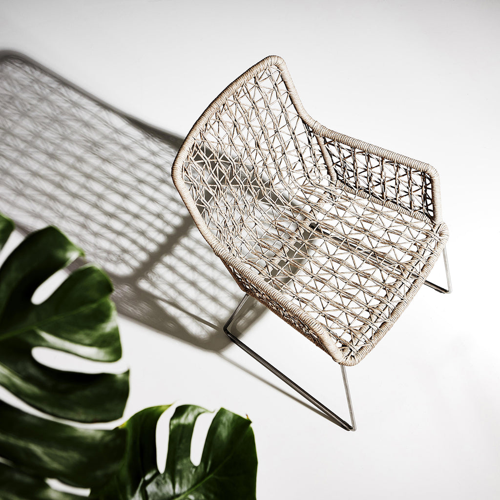 Striking design comes from an open weave crafted of twisted abaca All-Weather Wicker on the Bernhardt Exteriors Carmel arm chair. But the pattern isn't just about style; it also provides a comfortable back for outdoor lounging. Woven over a stainless steel base, the wicker is made to withstand weather conditions outdoors but is beautiful enough for indoor rooms.