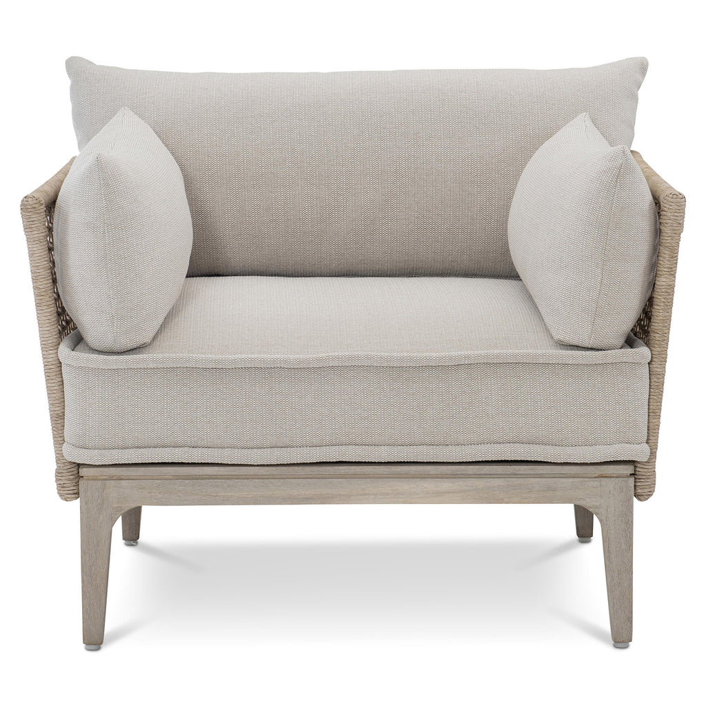 In a mix of stunning textures, the Bernhardt Exteriors Catalonia chair is designed with twisted abaca all-weather wicker across the sides and back, over a frame of sun-washed teak. A deep seat cushion is flanked by a back pillow and two bolsters for ease and comfort. The elevated outdoor look breathes fresh air into exterior design with uniquely beautiful materials.