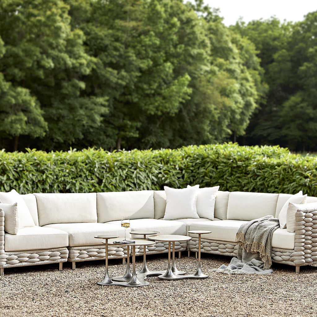 A connection is made on the Bernhardt Exteriors Cerchi outdoor accent table, with a base that melds two surfaces into one table. Crafted of cast aluminum in the Graphite finish, the table bridges high design with outdoor styling.
