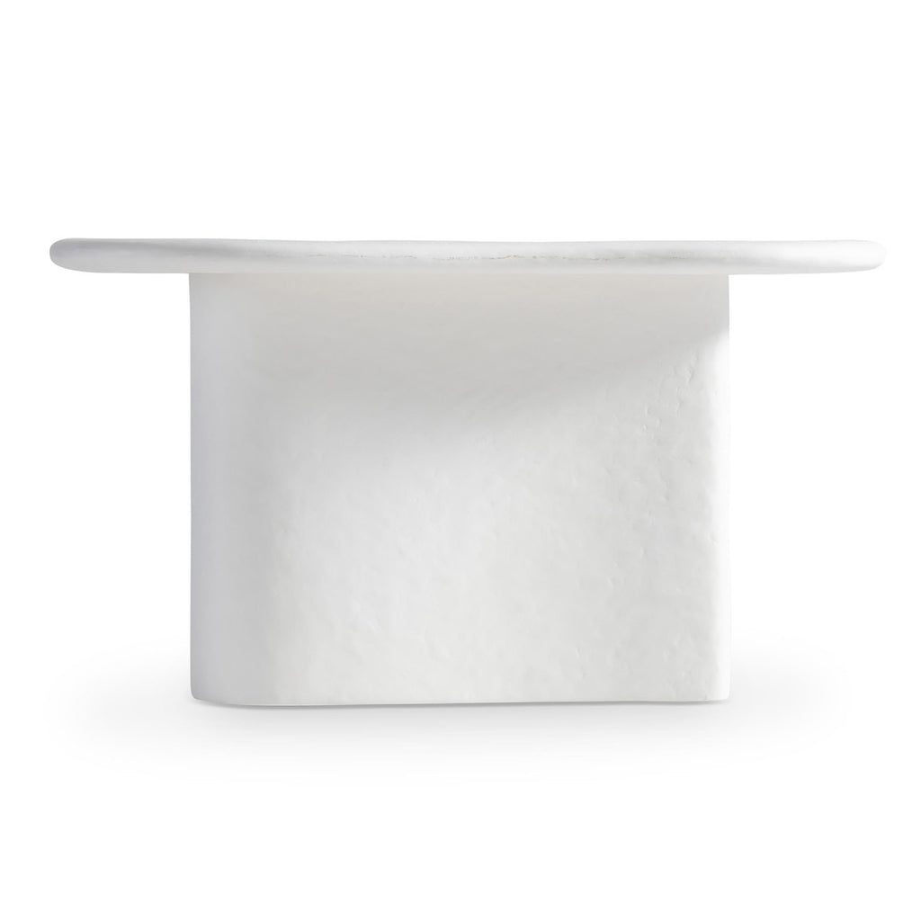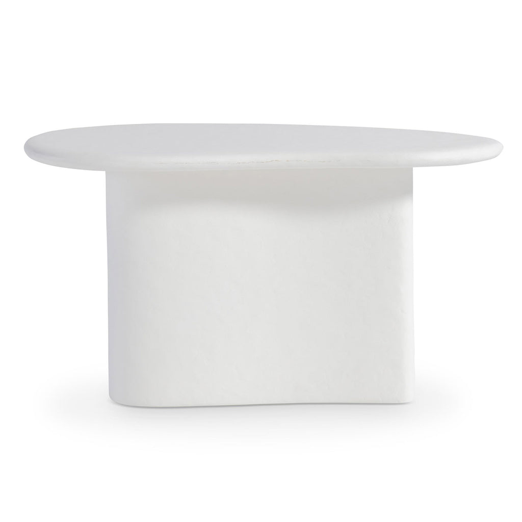 A boldly shaped and flowing base supports a freeform top on the Bernhardt Exteriors Fresco accent table. The modern organic style has rounded edges and curves that offer an unstructured design. The outdoor design is crafted of glass-reinforced concrete with a plaster texture in Chalky White.