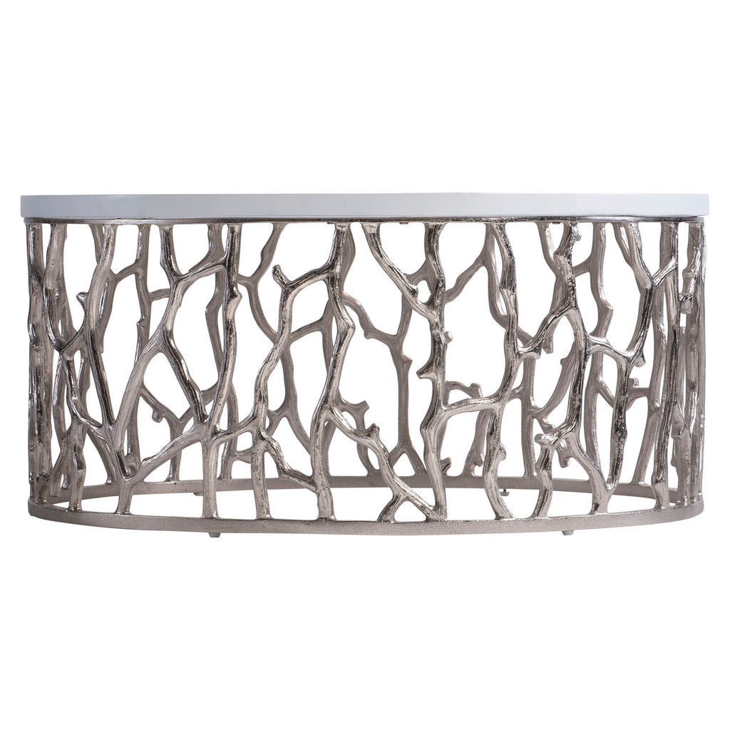 Branches crafted in cast aluminum intertwine and intersect around the base of the Milos outdoor cocktail table. The faux bois design creates an openwork pattern that’s both natural and dramatic. The base supports a glass-reinforced concrete top in Bone finish.
