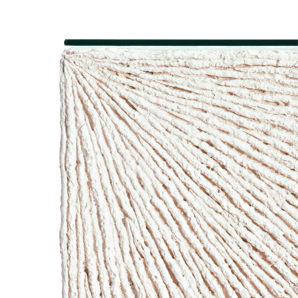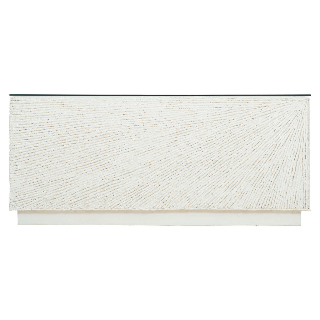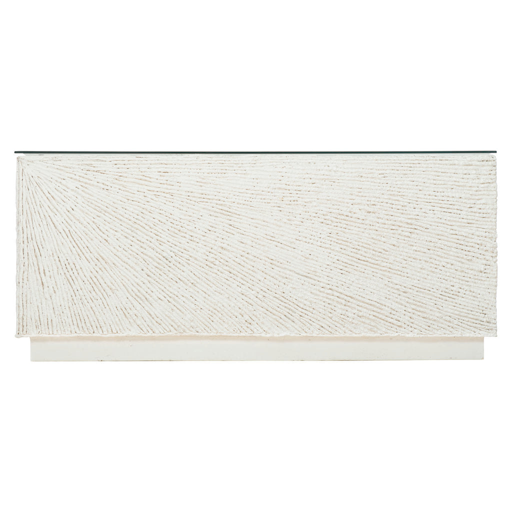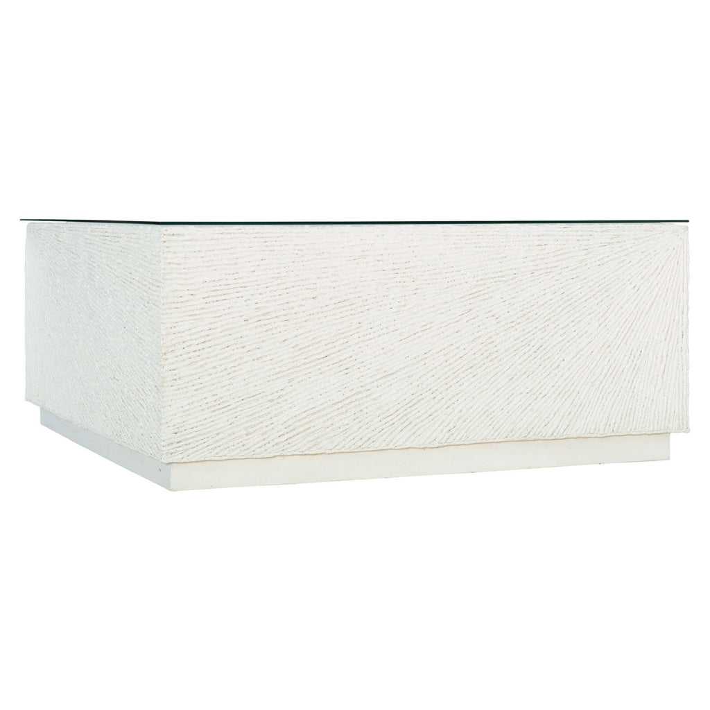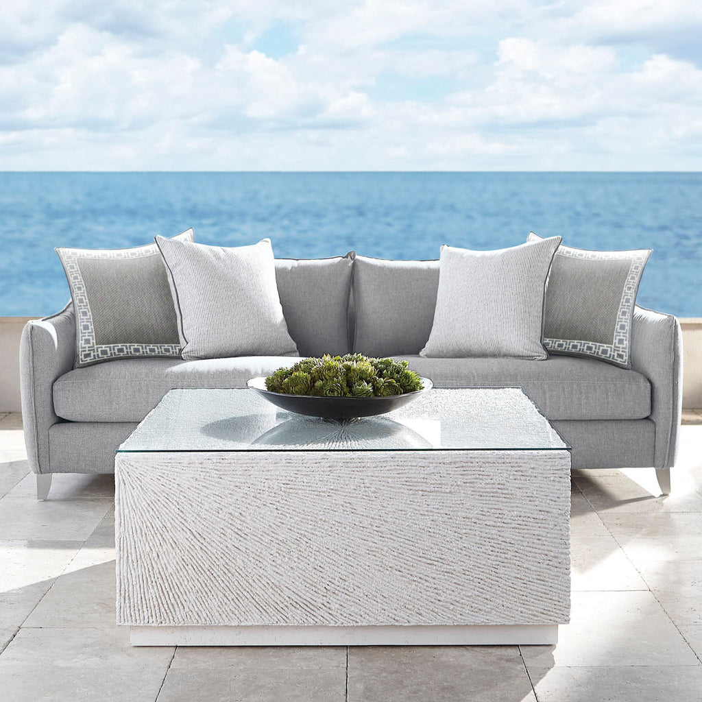 Characterized by exceptional luxury and sophisticated design, Bernhardt Exteriors offers a selection of elegant yet durable accent tables for every type of setting. The Tenerife cocktail table is crafted from natural stonecast with a unique coco twig pattern. A lay-on tempered glass top with a polished edge provides a smooth, sleek contrast to the textured stonecast. Clean and simple, this table reflects a stylish, modern approach to outdoor design.