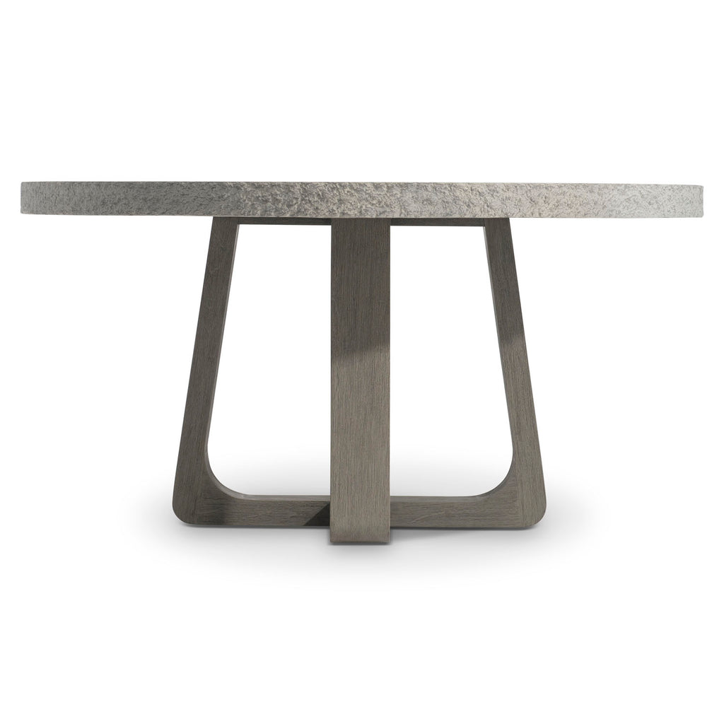 A modern organic design showcases the look of rough-hewn stone over the teak base of the Trouville dining table. The round, concrete top offers a chiseled edge and is finished in Sand Grey. The balance of natural materials is formed with intersecting curved pedestals in loops of teak. The natural style, at home in an outdoor setting, is equally beautiful indoors.