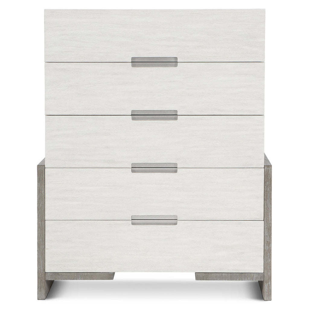 Bernhardt Foundations is a new, refined expression of modern rustic, defined by a minimalist style and relaxed comfort. The Foundations tall drawer chest features a two-tone theme and substantial, thick-cut planes. Five drawers, finished in a muted oyster, contrast with its darker wood frame. This handsome piece offers an instant upgrade to any bedroom.