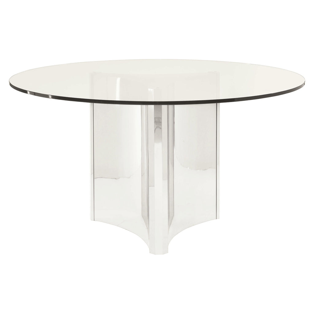 Modern and glamorous, this unique dining table features a sculptural steel pedestal in a gleaming stainless steel finish.