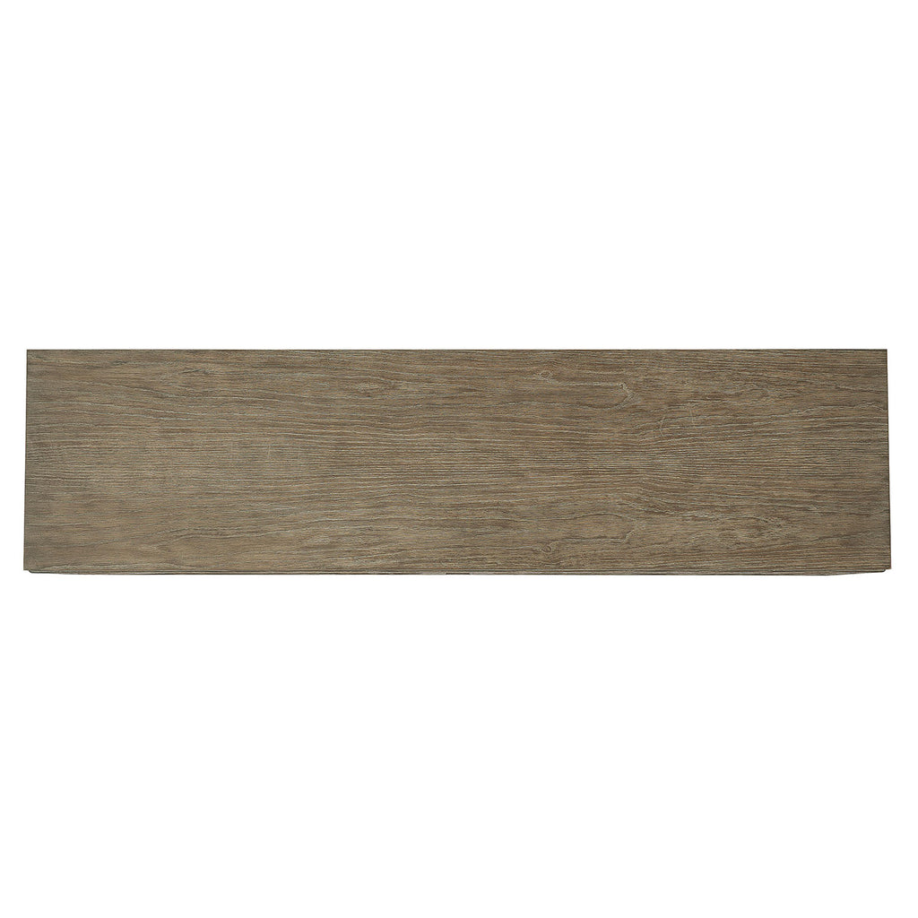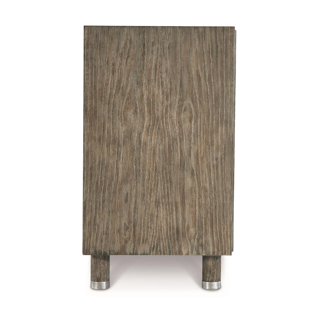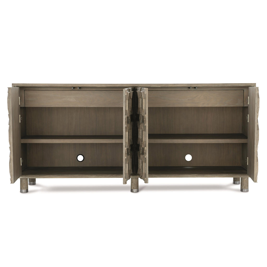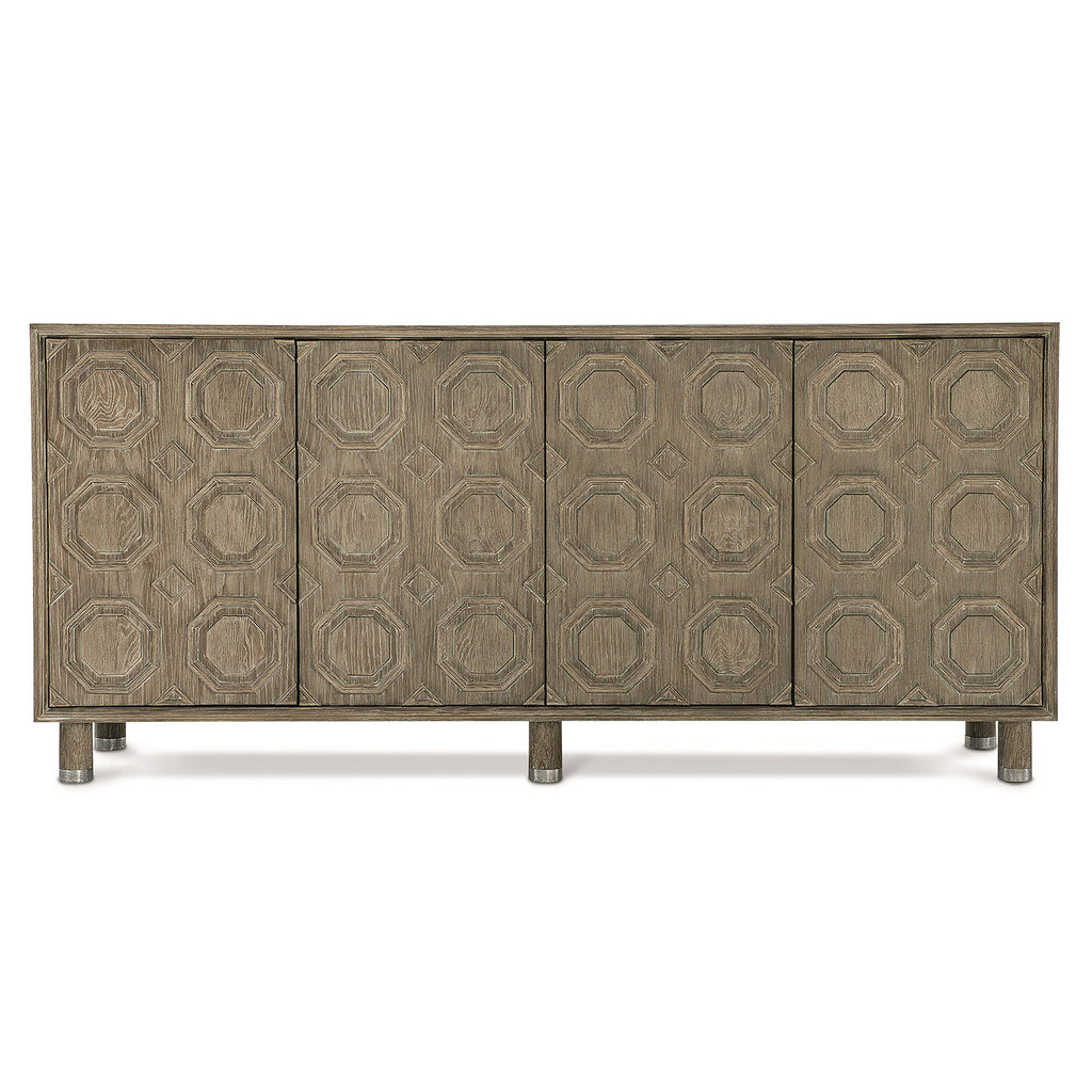 The Bernhardt Interiors Alhambra storage credenza features quintessential Art Deco design: decorative marquetry, geometric shapes and straight, smooth lines. The four touch-latch rustic oak doors are embellished with striking hexagon and diamond marquetry. Six cylindrical legs are capped with shiny nickel-plated aluminum.