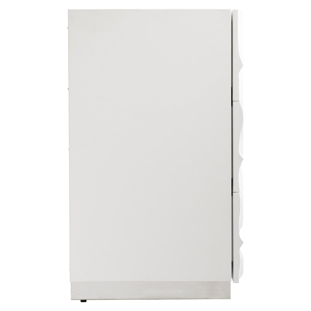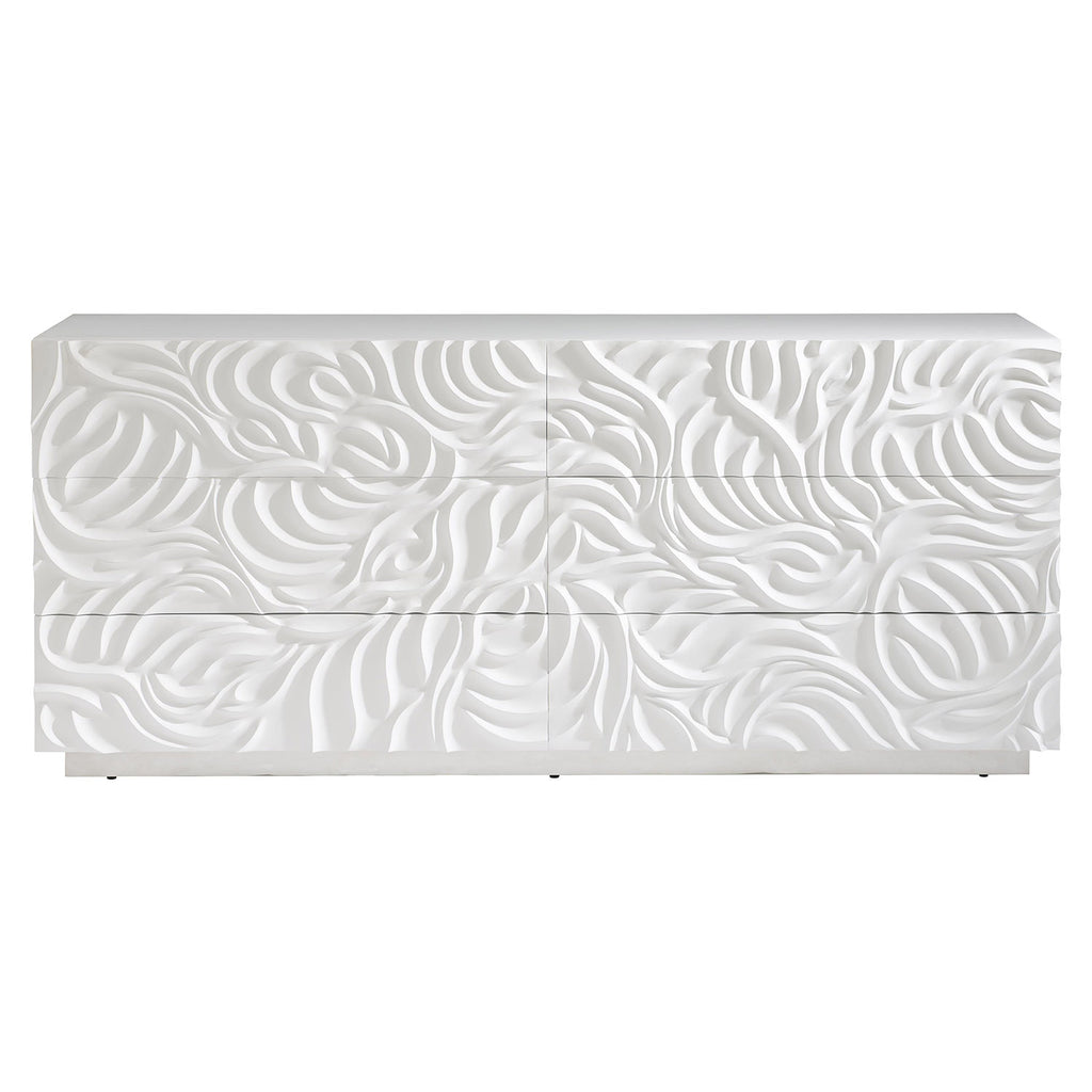 Textural drama and movement make a stunning statement on the Bernhardt Interiors Alia dresser. The modern organic look is achieved with gorgeous swirls on the carved cast drawer fronts, completed with our White Plaster finish. The deep carvings resemble the interior of a rare shell or the intricate whorls of a peonys bloom. The inspired design rests on a plinth base of polished stainless steel.