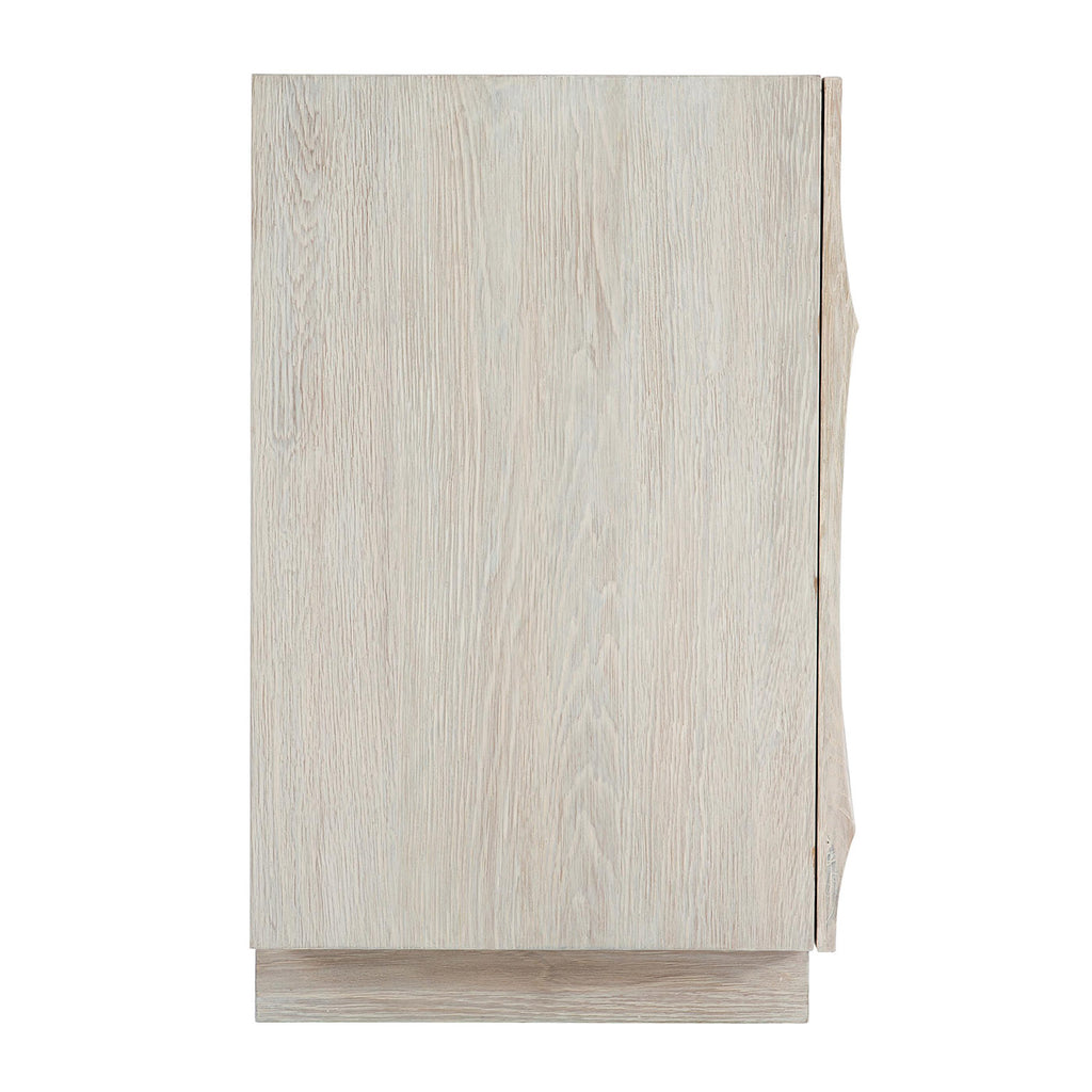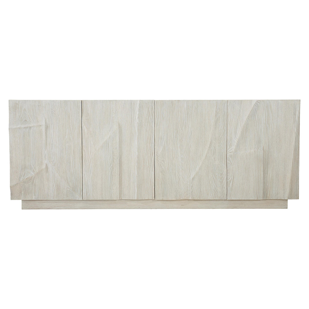 Simple and stylish, the Bernhardt Interiors Alvarez entertainment credenza is artfully crafted from pale, textured wood resting on a matching plinth base. Four symmetrical push-to-open doors are hardware-free, creating a sleek modern look.