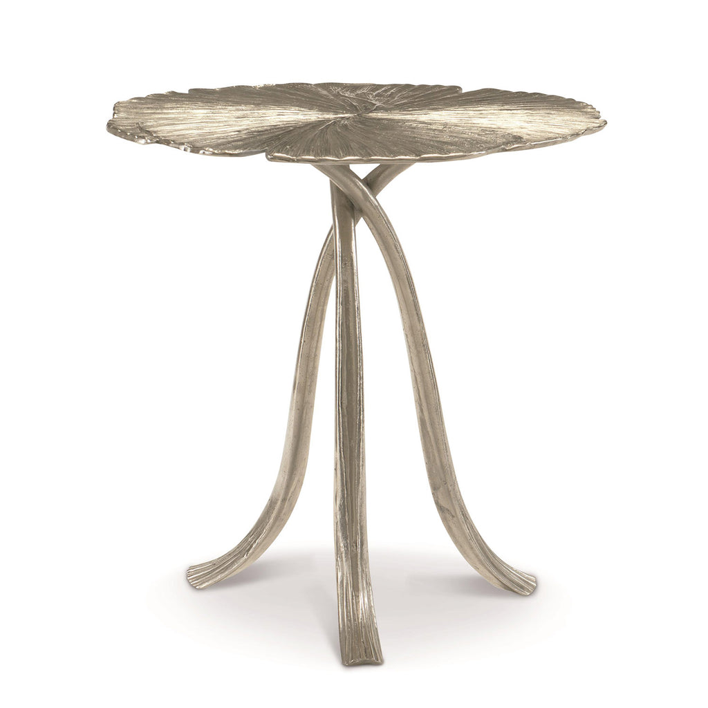 Bernhardt Interiors is an eclectic collection of luxury home furnishings featuring fine craftsmanship, unique materials, and a distinctly modern styling. With a top inspired by ginkgo leaves and three intertwined legs resembling stems, the Annabella end table creates an organic, shapely design. A satin nickel finish gives this cast aluminum table a subtle luster, contributing to its delicate, feminine appeal.
