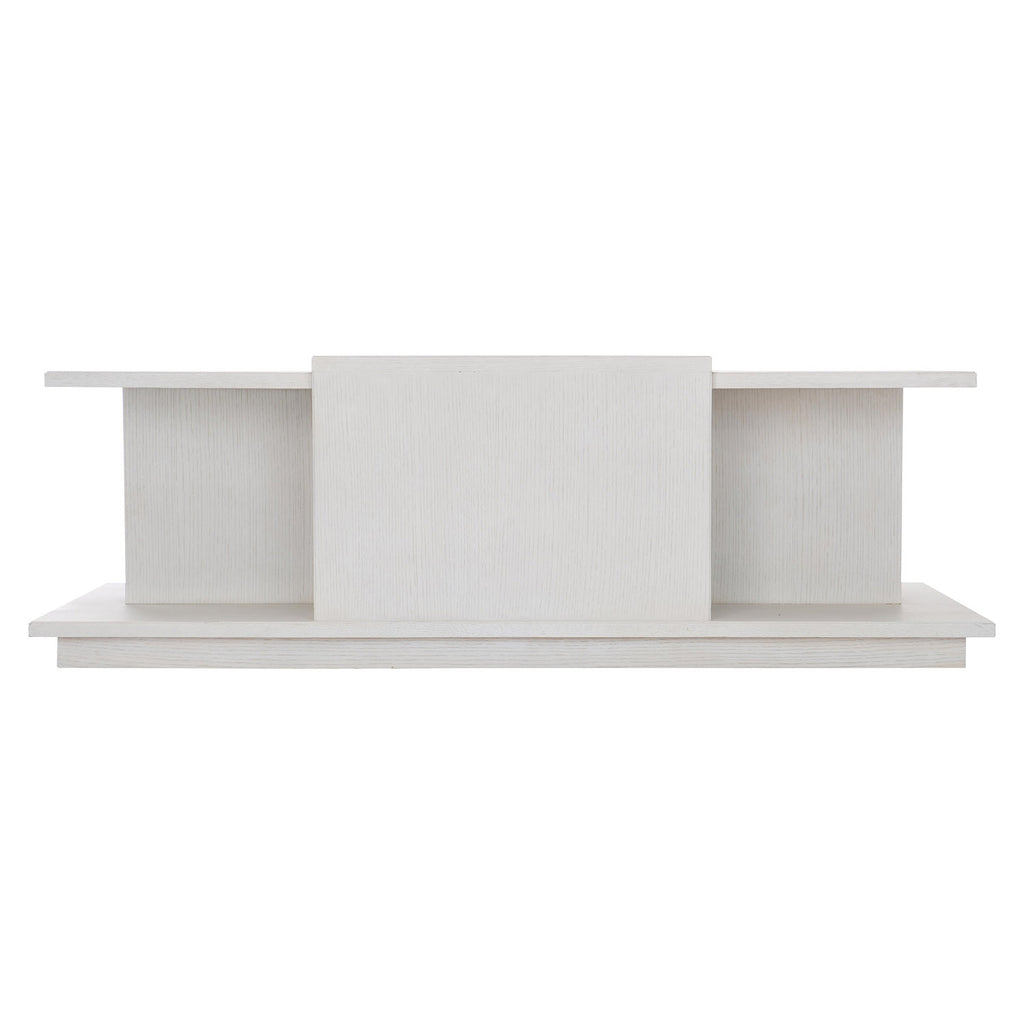 The Bernhardt Interiors Arnette cocktail table takes an architectural approach to composition and shape, offering visual variety and multiple surfaces for display. The multilevel top features a taller center section, while the extended base creates a shelf at the corners. Wire-brushed quartered oak veneers in white finish feature a linear wood grain for a look of understated luxury.