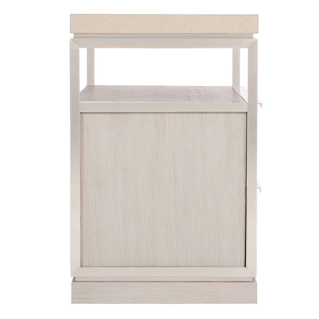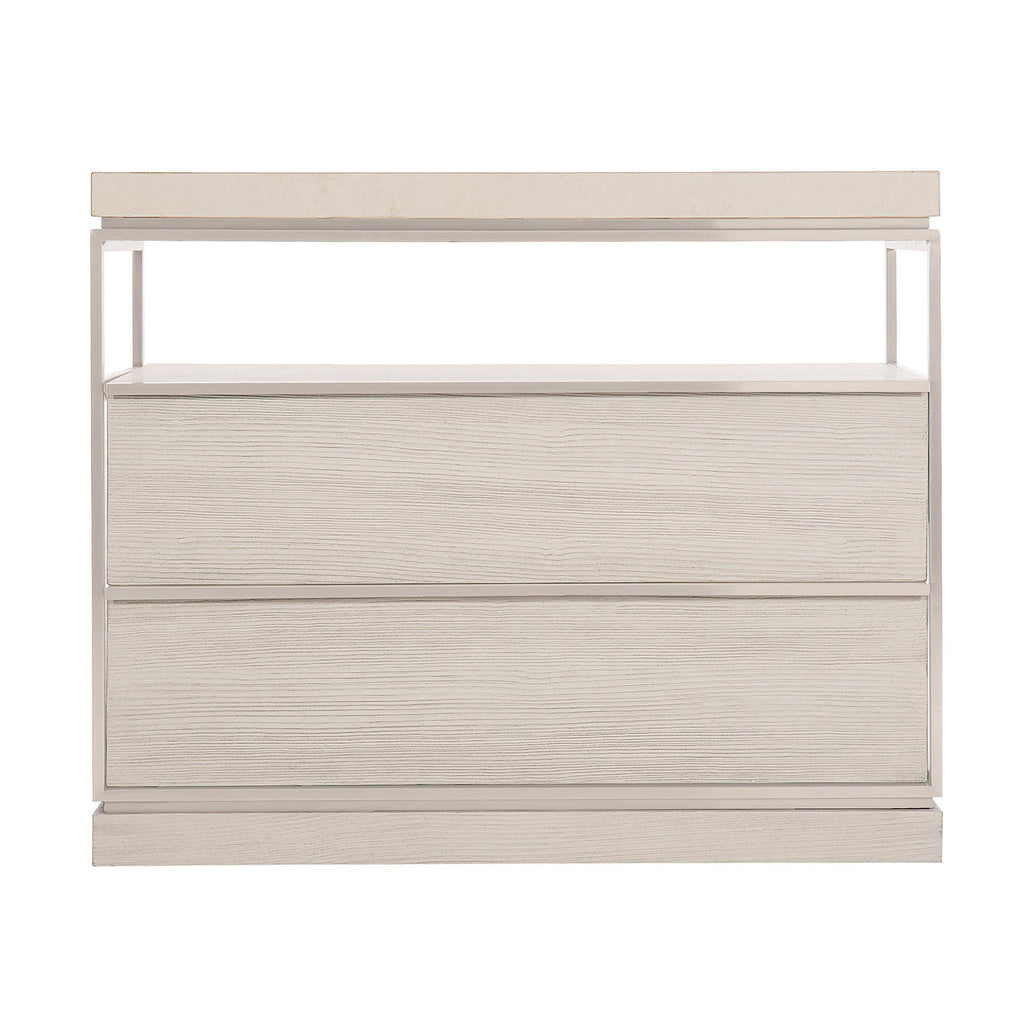 Influenced by Scandinavian minimalism, the Bernhardt Interiors Bryne nightstand achieves a sophisticated contemporary style with its simple, practical form. The streamlined design features two drawers and an open compartment topped with laminated white marble. The wire-brushed quartered pine veneers feature a muted Bone finish that highlights the linear wood grain. A stainless steel frame in Tarnished Nickel finish emphasizes the clean horizontal lines while adding a hint of shine to the otherwise subdued palette.