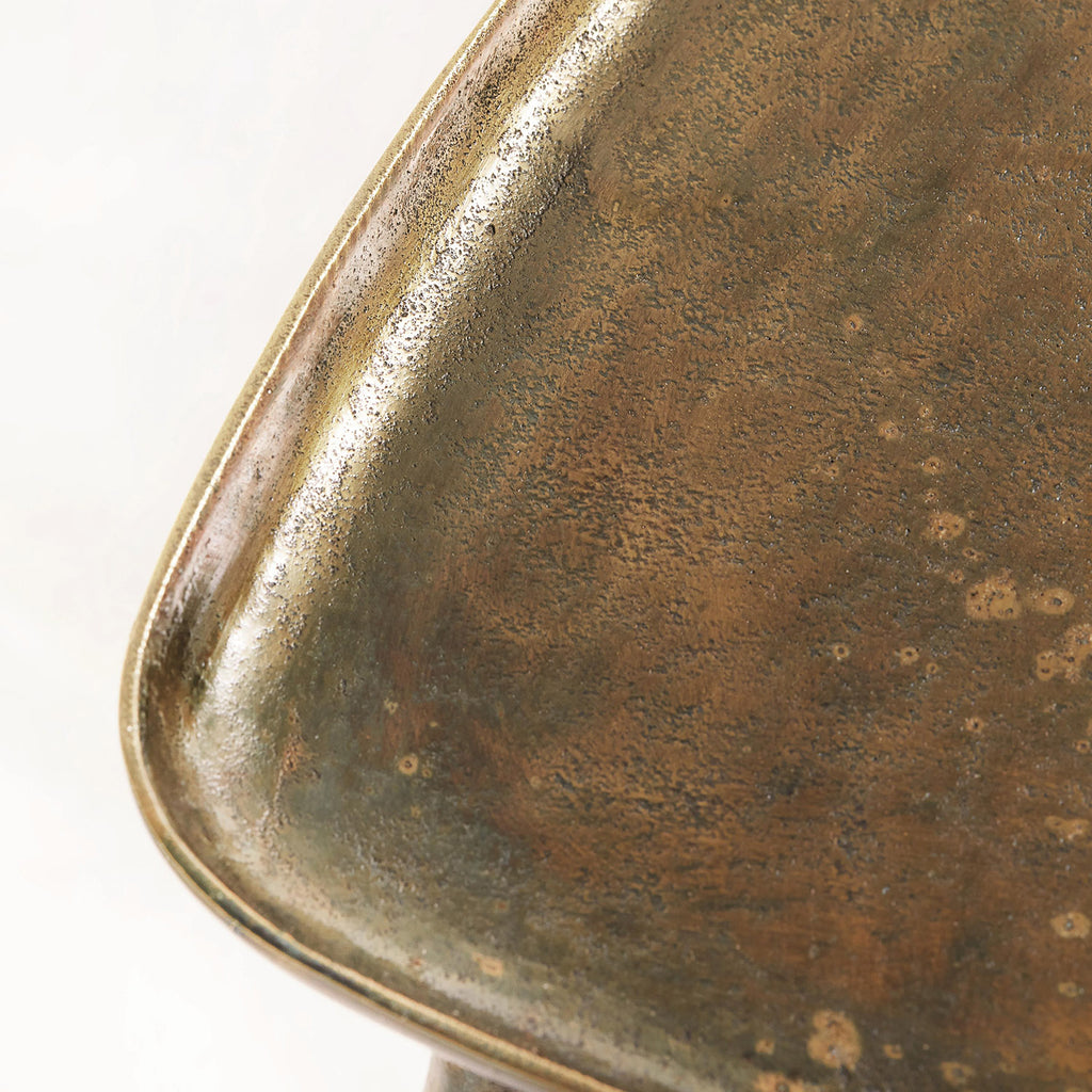 Bernhardt Interiors offers an eclectic array of artistic tables with a distinctly modern styling. The Buckley end table joins a tripod base with a triangular top with raised edges. Inspired by modern industrial design, the table is crafted from cast aluminum with an antique dark brass finish that adds to the unique character of the piece.