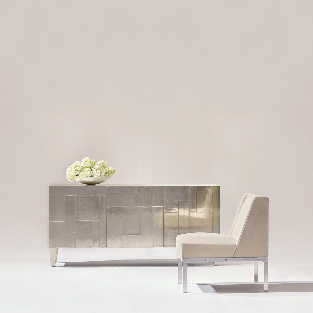 Bernhardt Interiors offers high-design furniture with an eclectic edge. The Carlton entertainment console is among the most outstanding of the collection. Meticulously crafted from German silver, it features a dynamic rectangular block pattern, both modern and futuristic in feel. Four tapered legs add an appealing detail.