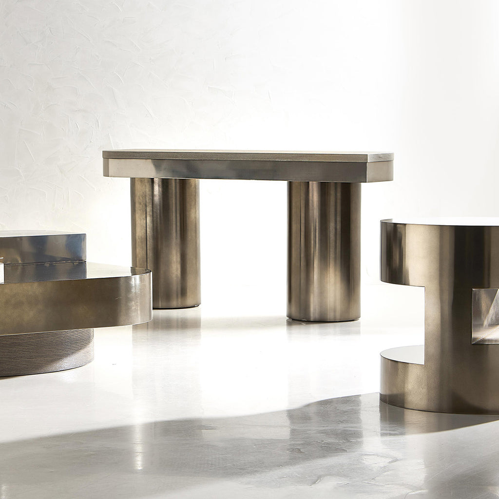 The Bernhardt Interiors Cassie side table offers a checkmate in the style stakes, showcasing a sculptural design inspired by a modern chess piece. A Dark Bronze finish adds depth and visual interest while cutout sides create unique shelves.
