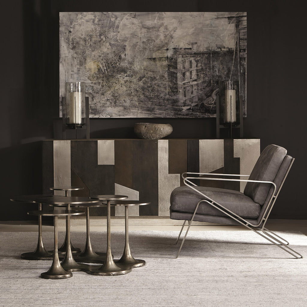 Bernhardt Interiors offers an eclectic array of artistic tables with a distinctly modern styling. Crafted from cast aluminum in a graphite finish, the Circlet cocktail table features seven tulip tables of varying sizes with slender stems connecting them to a central base. This sculptural, organic design offers shape and movement with one-of-a-kind appeal.