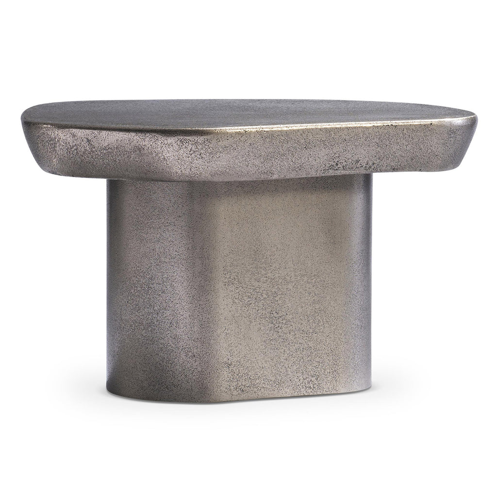 An organic shape in cast aluminum forges a unique form for the Bernhardt Interiors Clawson cocktail table. Finished in Graphite, a free-flowing top is perched on a shaped pedestal. The stunning table can be used independently or as a lovely interlocking set with the other Clawson cocktail table designs.
