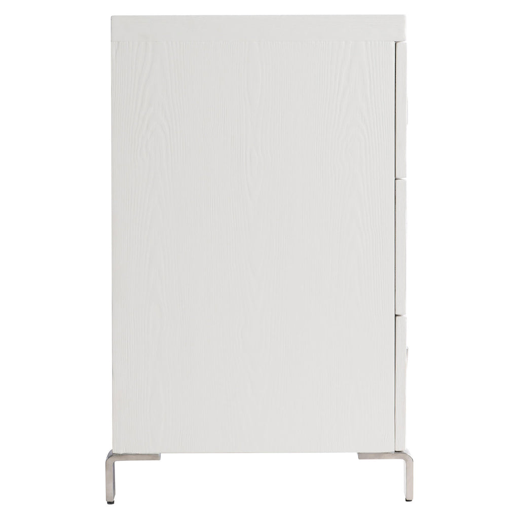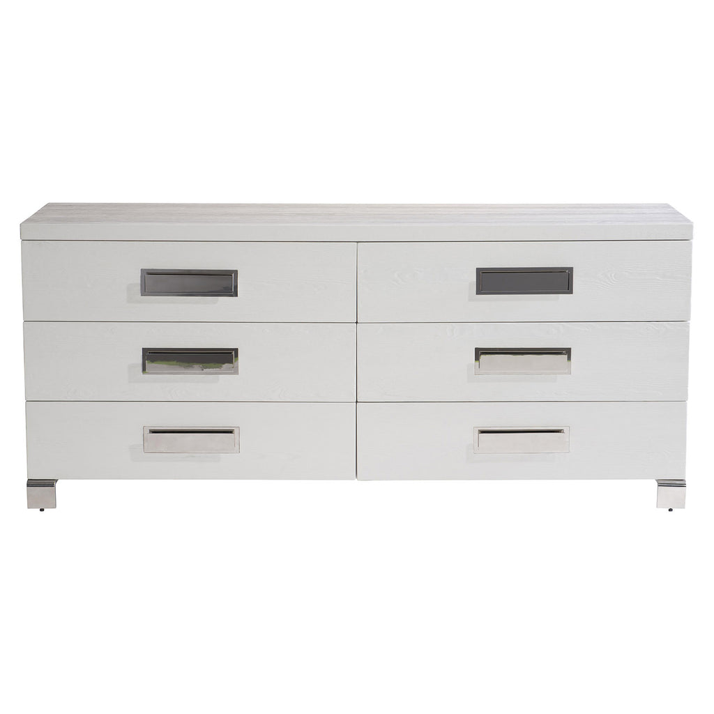 The Bernhardt Interiors Coro dresser draws all eyes with its modern geometric design. Bold stainless steel hardware provides a dimensional look on six Azucar-finished drawer fronts. Stainless steel is also shaped into unique feet for this dresser.