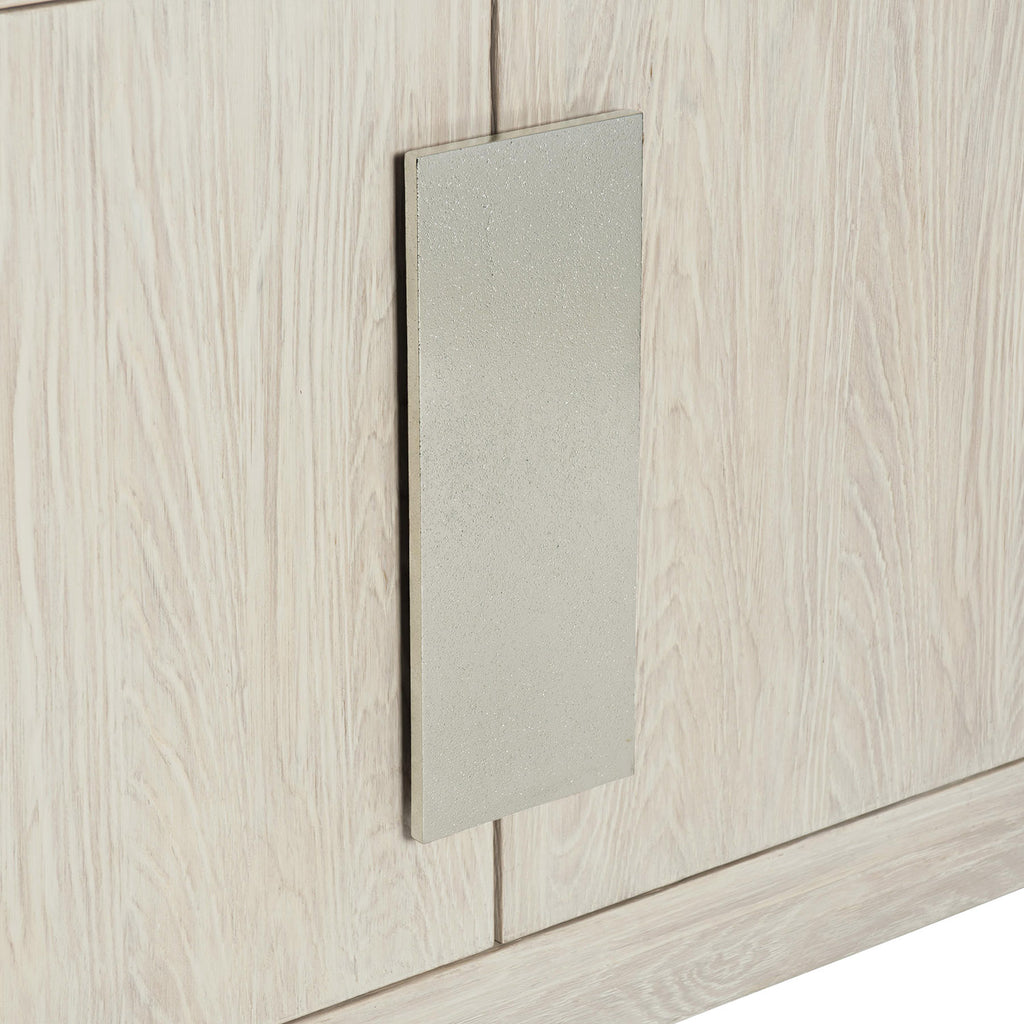 Inspired by Bauhaus design, the Bernhardt Interiors Ellis etagere is fresh and engaging with an asymmetrical form and a unique juxtaposition of materials. White oak veneers in a jicama finish pair elegantly with cast aluminum in a shiny nickel finish. In addition to three open shelves, it features two enclosed shelves for additional storage. Linear and geometric, this piece makes a sophisticated, artistic statement.