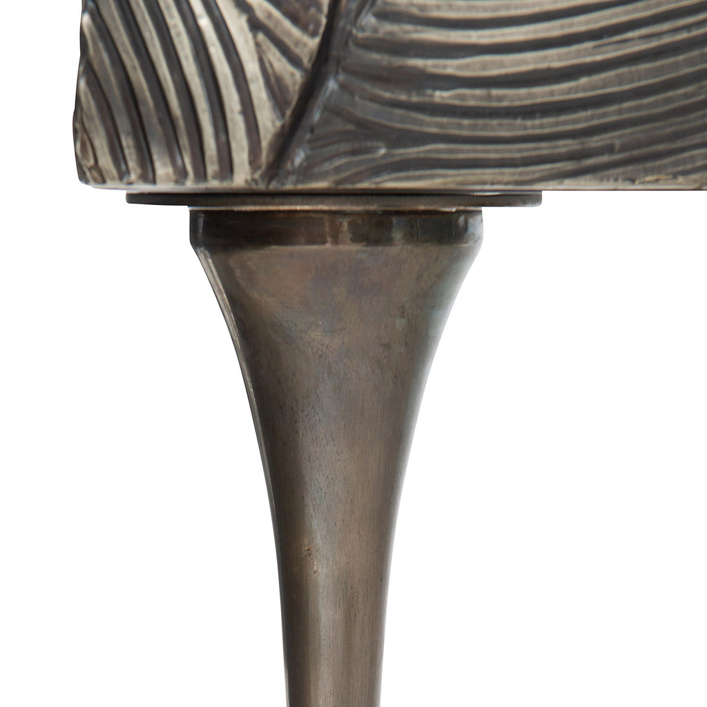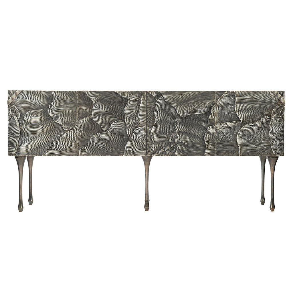 A stunning statement piece, the Bernhardt Interiors Flora credenza presents layers of dimension, texture and detail in German silver. Flowing across the doors is a pattern evoking the organic beauty of flower petals. An antique silver finish lends a timeless glamour. Each pair of soft-closing doors opens to reveal a removable shelf and grommet hole for wire management.