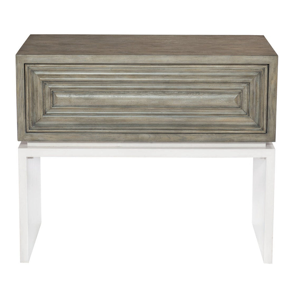 Fine craftsmanship, unique materials, and modern styling characterize the eclectic Bernhardt Interiors collection. The Goodman nightstand carves out a unique look by merging contrasting styles and finishes. A Rustic Gray finish on the white oak veneers lends a warm, natural look, while a White Plaster finish on the minimalist base is clean and contemporary. The beautifully crafted, touch-to-open drawer eliminates the need for hardware, adding to the streamlined look.