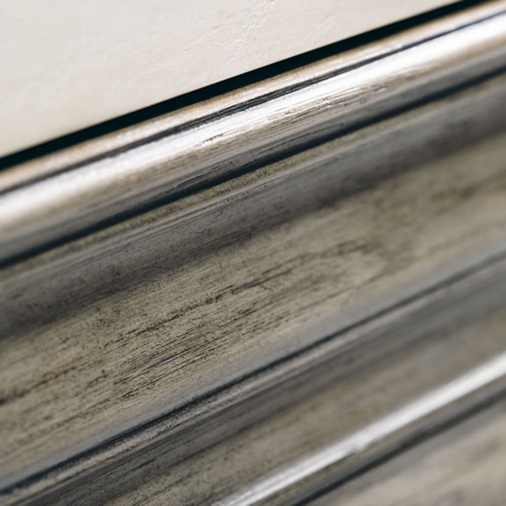 • Two tone combination finish with Rustic Gray finish on drawer box, top and ends and White Plaster finish on remainder of case.
