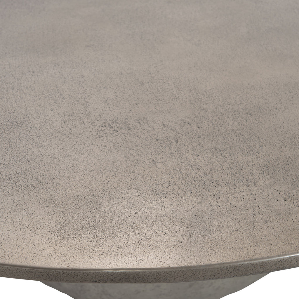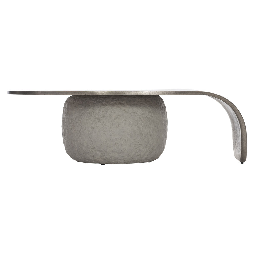 Innovative form and unique materials are the basis for this high-impact cocktail table. Designed with a teardrop shape cast aluminum surface supported by a textured cast concrete base, the Kaori cocktail table is a study in nonconformist style. It is both modern and primitive, industrial and sleek, crafting a uniquely balanced design.