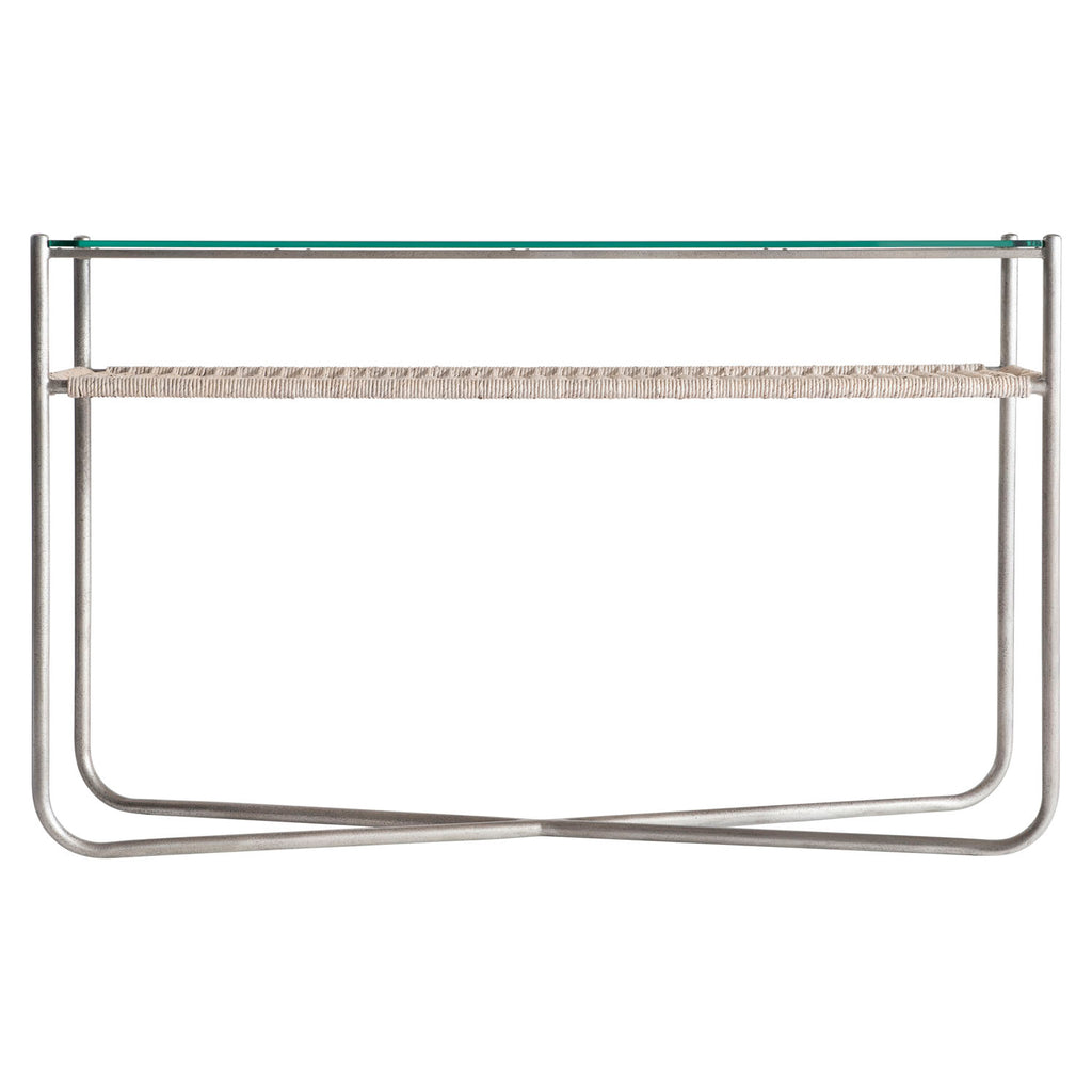 Glass, metal and natural fibers combine for a modern organic design in the Kendo console table. A woven abaca shelf sits under a tempered glass top, adding a layer of chic texture. The steel frame has rounded corners and an X-shaped base finished in Graphite.