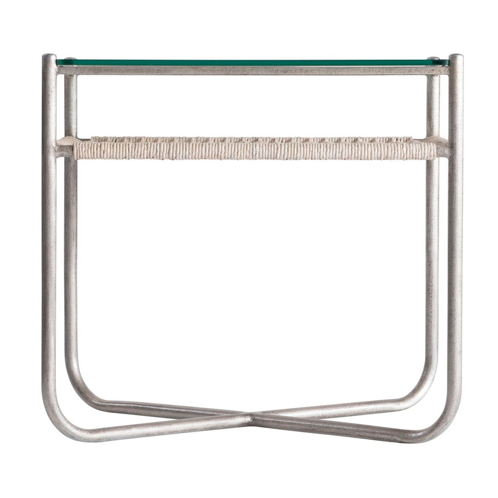 Glass, metal and natural fibers combine for a modern organic design in the Kendo side table. A woven abaca shelf sits under a tempered glass top, adding a layer of chic texture. The steel frame has rounded corners and an X-shaped base finished in Graphite.