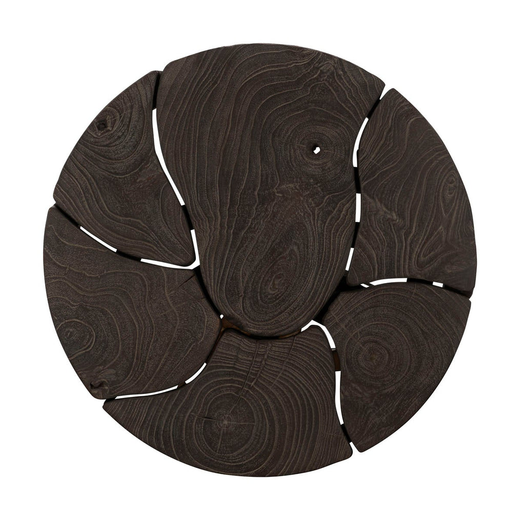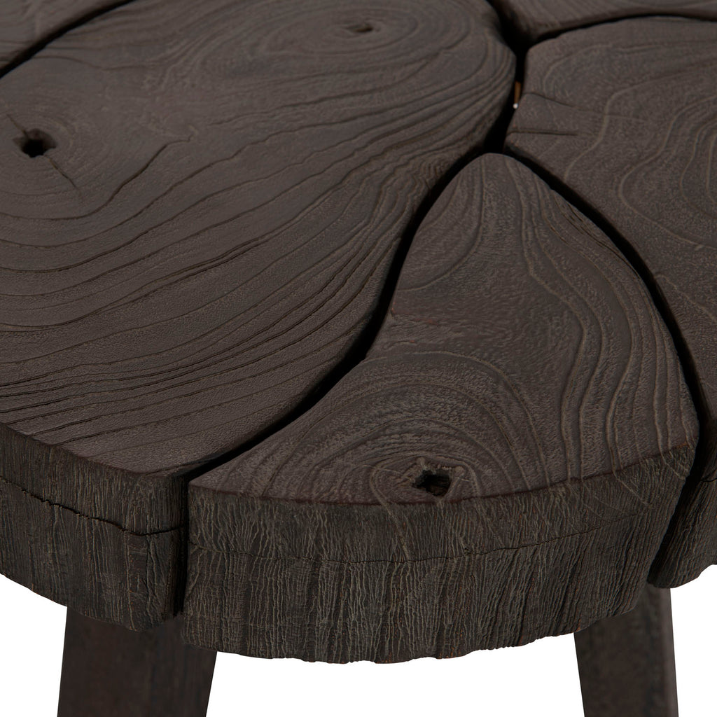 Crafted with a sliced teak top supported by a Saur wood base the Lanita accent table is the perfect mix of rustic and natural elements. Three legs meet at the top and then flare out at the bottom to be joined with stretchers for a stable base. Joined like a puzzle piece, the round top offers space for display while the unique base lends a contemporary touch to the overall look.