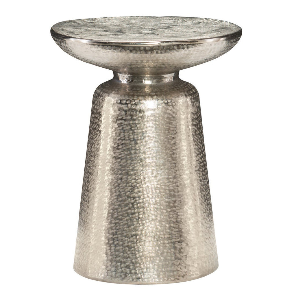 Fine craftsmanship and modern styling characterize the eclectic Bernhardt Interiors collection. Bright and curvaceous, the Lorraine round chairside table brings an eclectic feel and a touch of glamour to any room. A conical pedestal merges with a graceful bowl-shaped top, forming an elegant shape. A shimmering nickel finish on cast aluminum creates texture and shine.