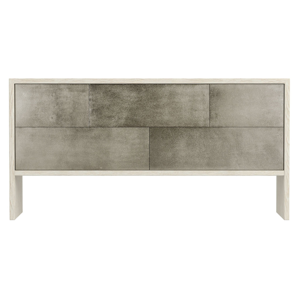 Bernhardt Interiors offers high-design furniture with an eclectic edge. Sleek and modern, the Lowe dresser features a minimalist wooden frame and five push-to-open drawers. White oak veneers in a jicama finish pair elegantly with cast aluminum in a shiny nickel finish.
